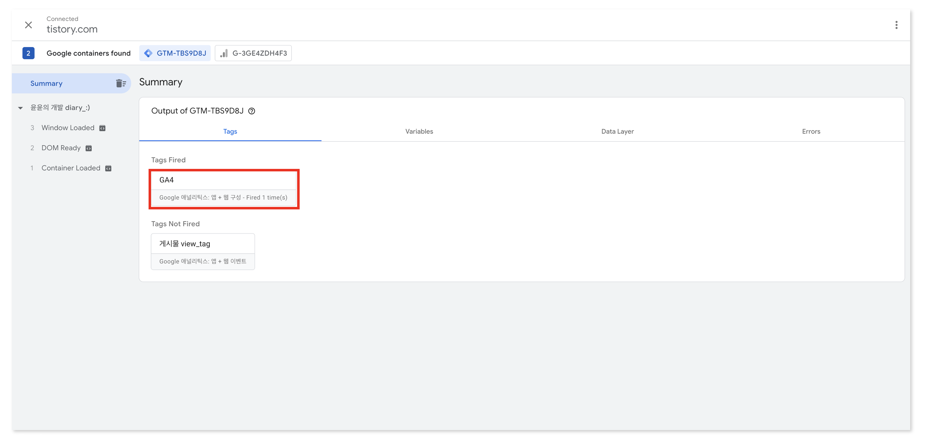 게시가 된 것을 확인한 후 GTM에서 미리보기를 눌러줍니다. GTM에서 설정해 둔 구성 태그가 터진 것을 확인합니다.