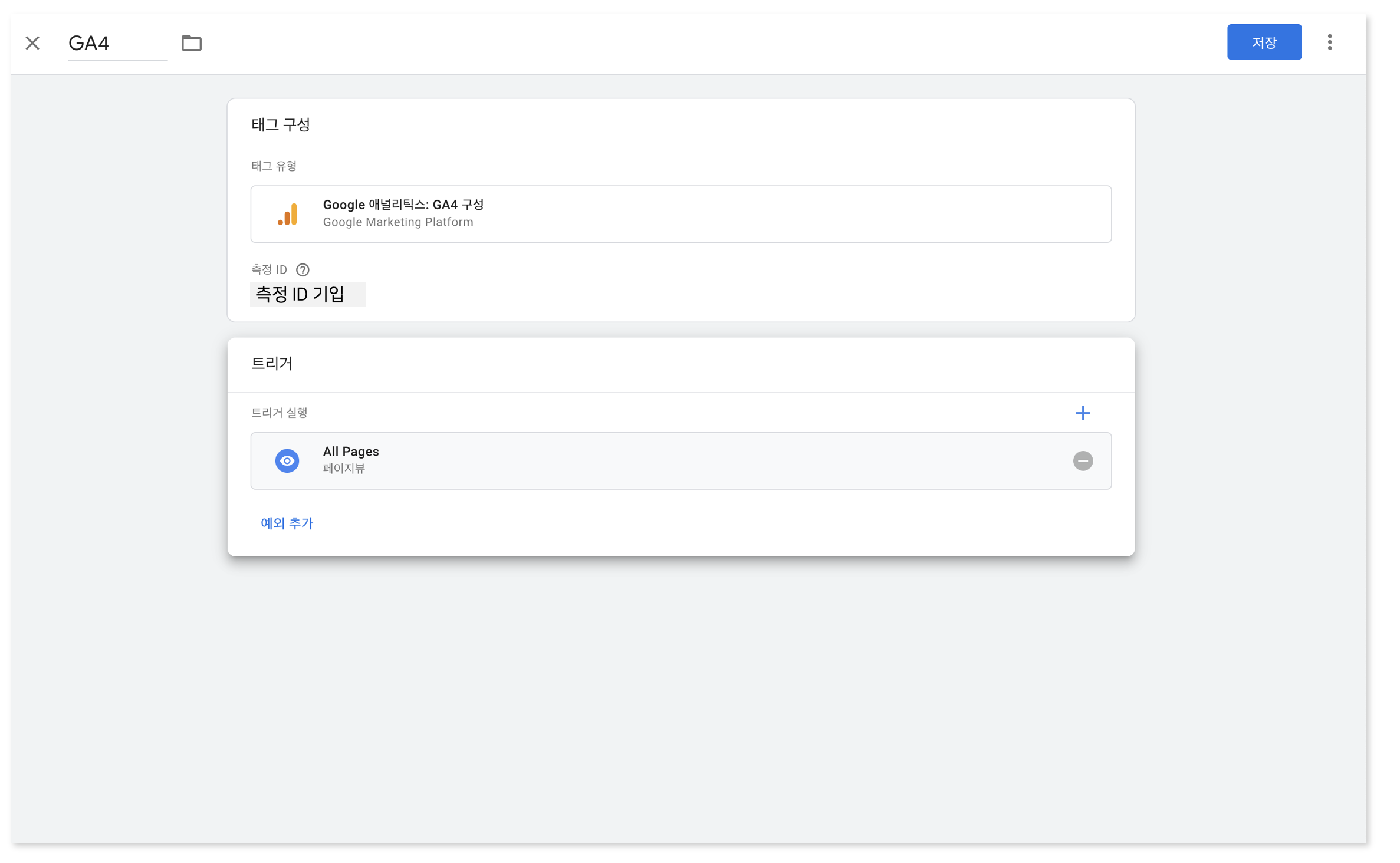 태그의 측정 ID 영역에 Google Analytics 4(GA4)에서 복사해 온 측정 ID를 입력합니다.