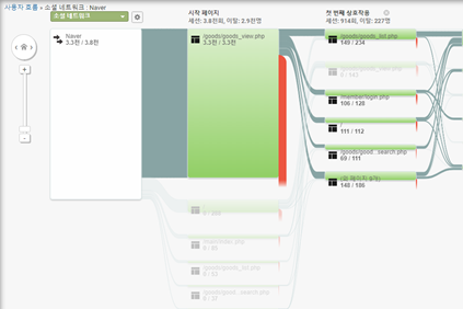 페이지 노드를 클릭하여 트래픽 강조표시를 선택하면 해당 페이지의 경유 트래픽의 흐름을 쉽게 확인할 수 있습니다.