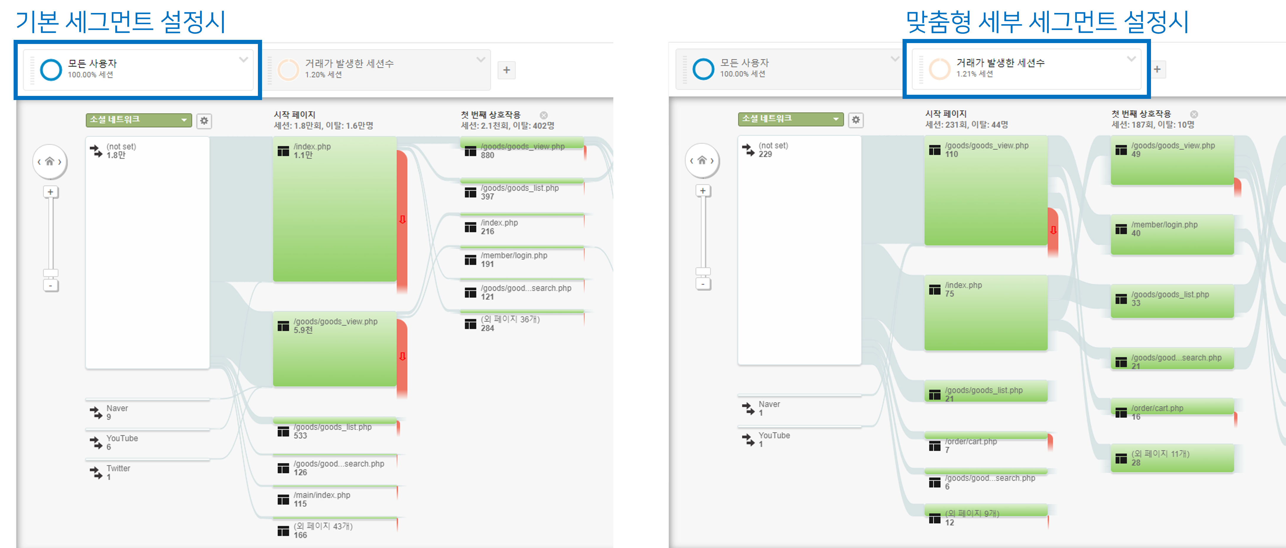 사용자 흐름 보고서 상단에 있는 세그먼트의 조건을 보고 싶은 정보에 맞춰 설정하면 더욱 세분화된 트래픽을 분석할 수 있습니다.