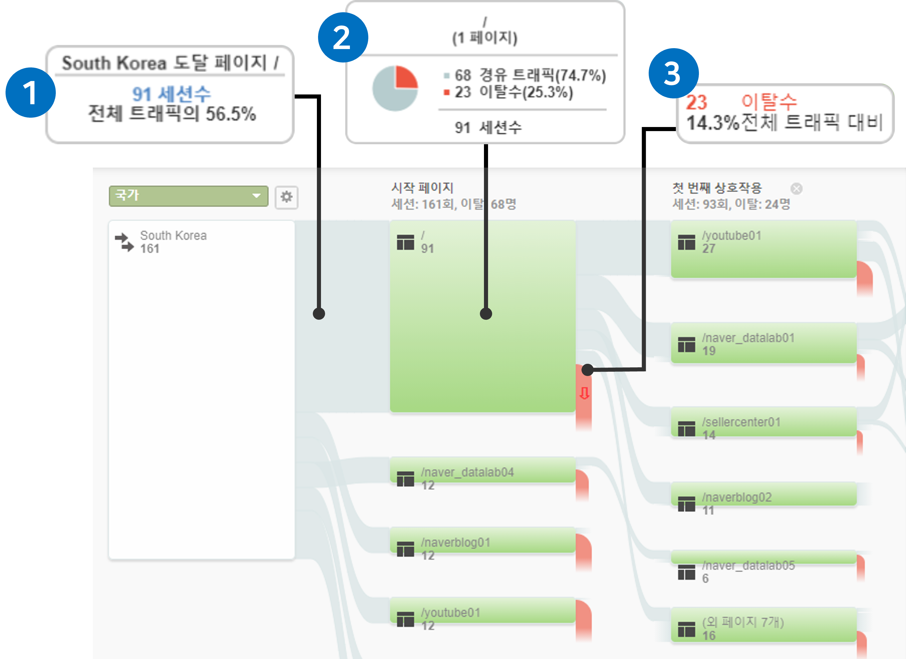 : 해당 페이지의 세션수와 경유 트래픽과 이탈수, 세션수에 대한 각각의 비율을 확인할 수 있습니다.