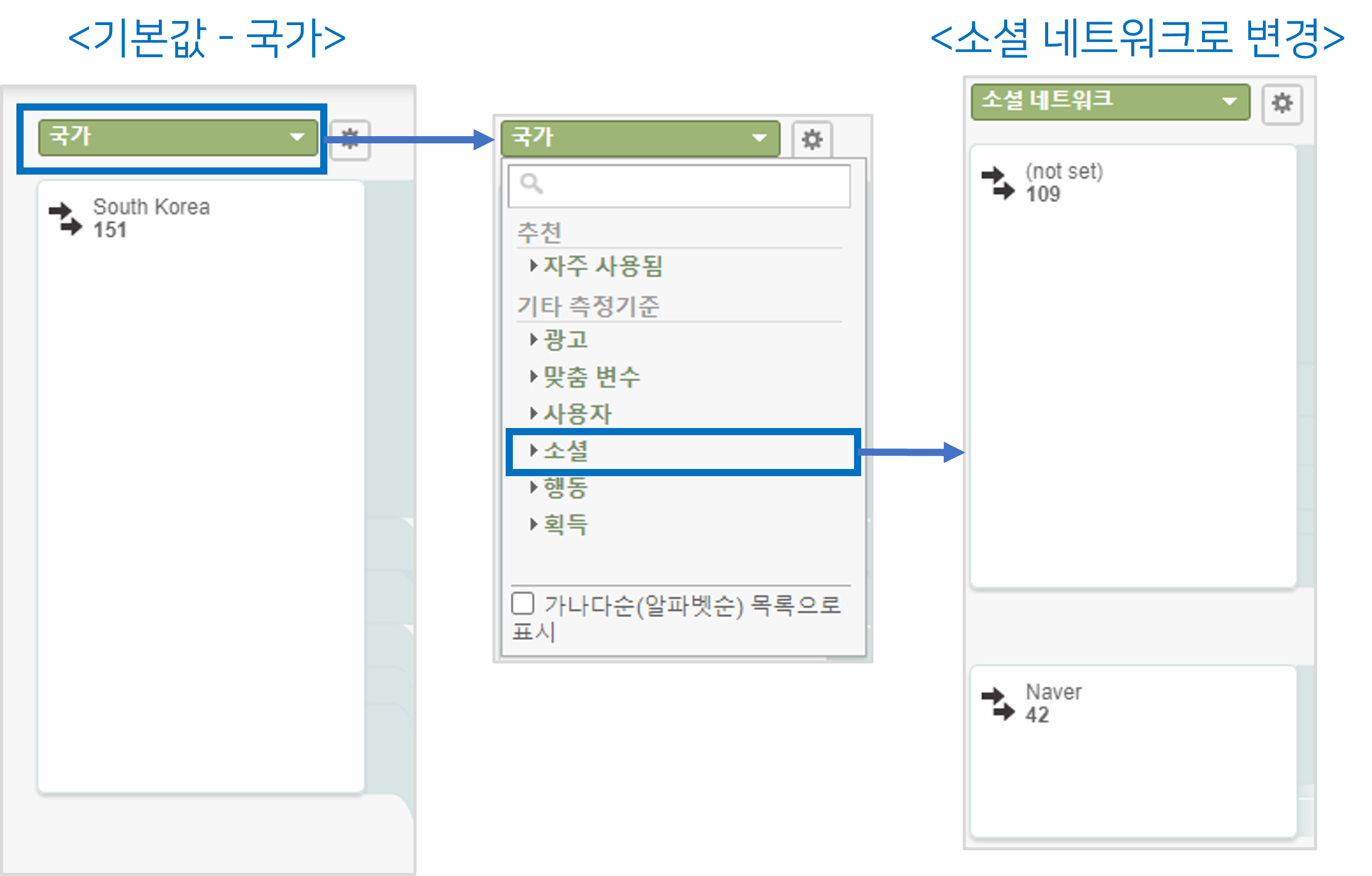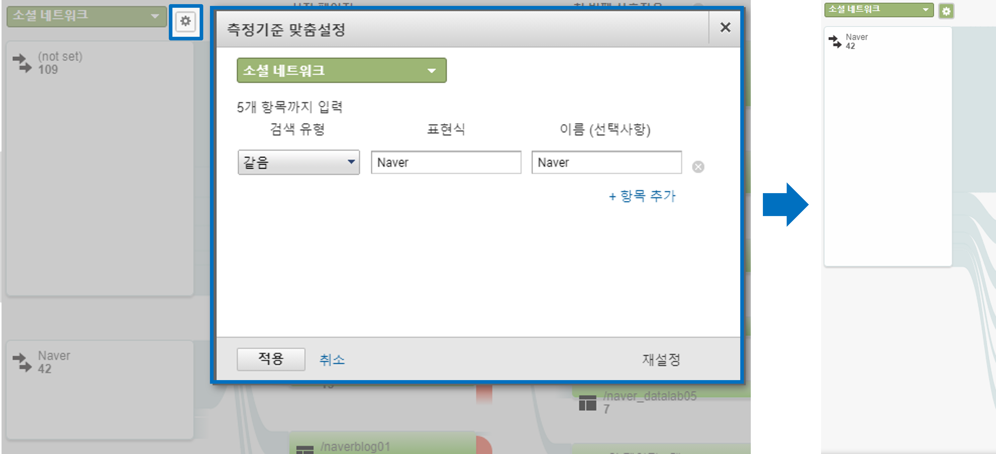 측정기준 노드 항목을 클릭하여 이 세그먼트만 보기 를 선택하면 해당 노드를 기준으로 세팅할 수 있고, 측정기준 보기 옆 설정버튼을 눌러서 측정기준 맞춤설정을 하면 원하는 항목만 선택해서 볼 수 있습니다.