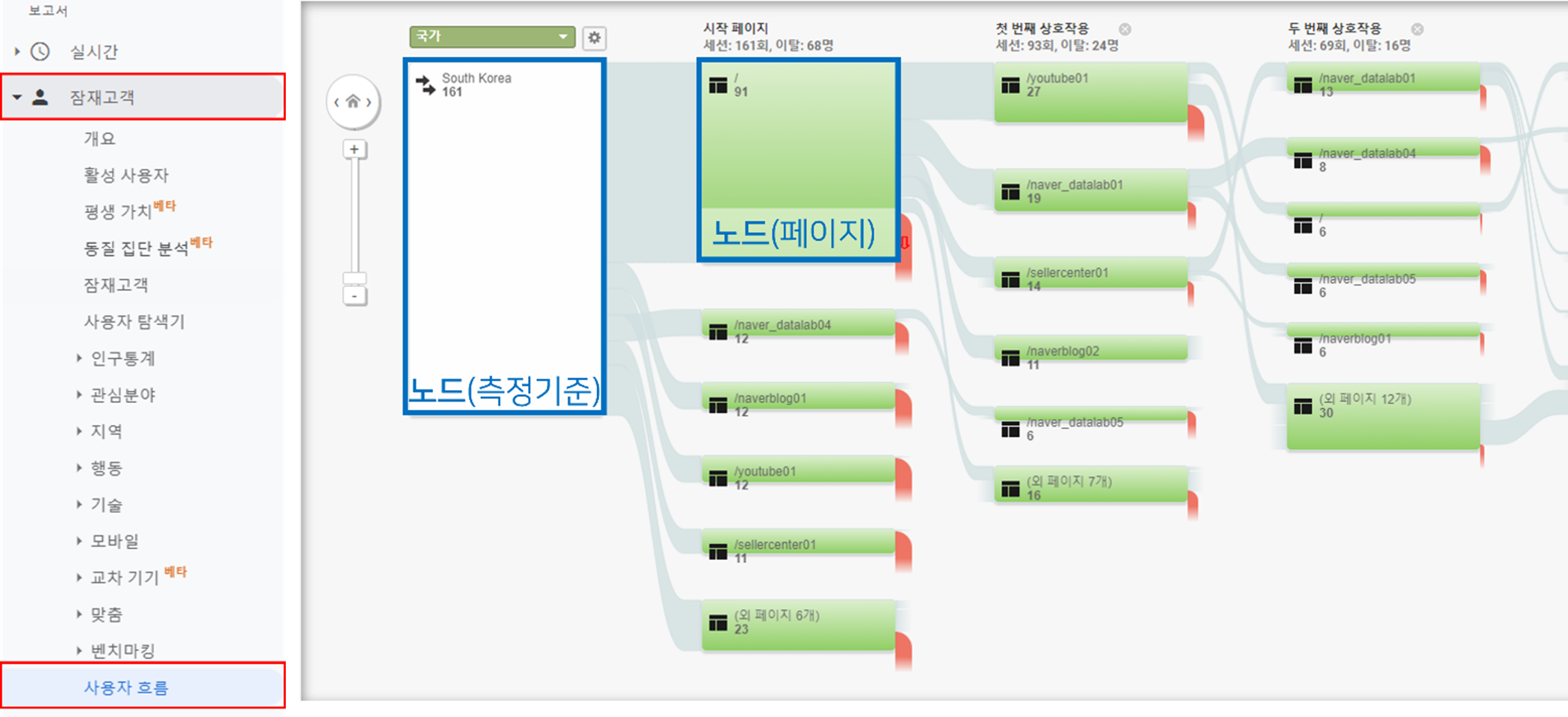 * 노드 : 사용자 흐름 보고서를 이루는 사각형으로 트래픽이 통과하는 지점
