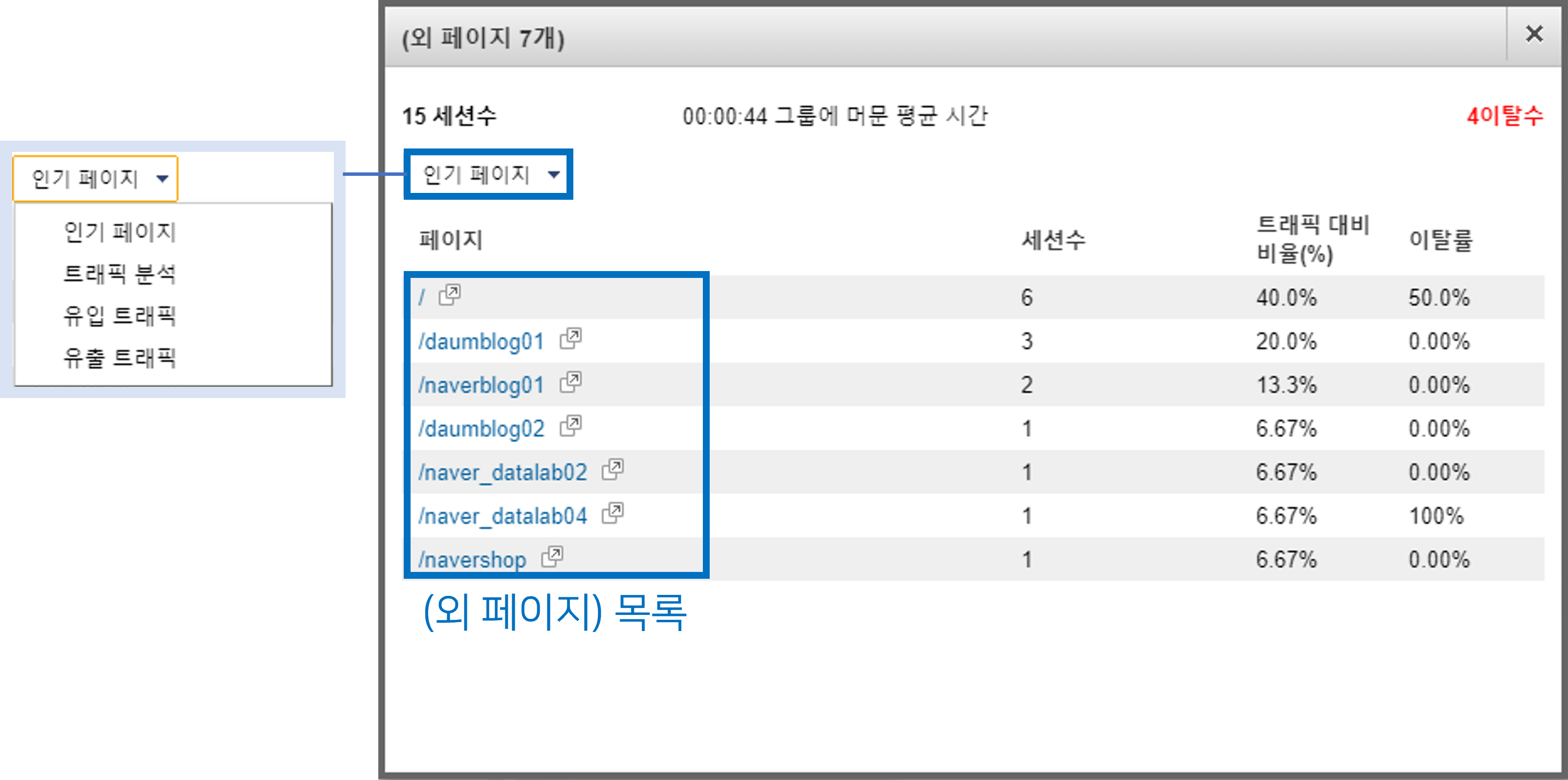: 해당 페이지의 이탈수와 전체 트래픽 대비 이탈률을 확인할 수 있습니다.