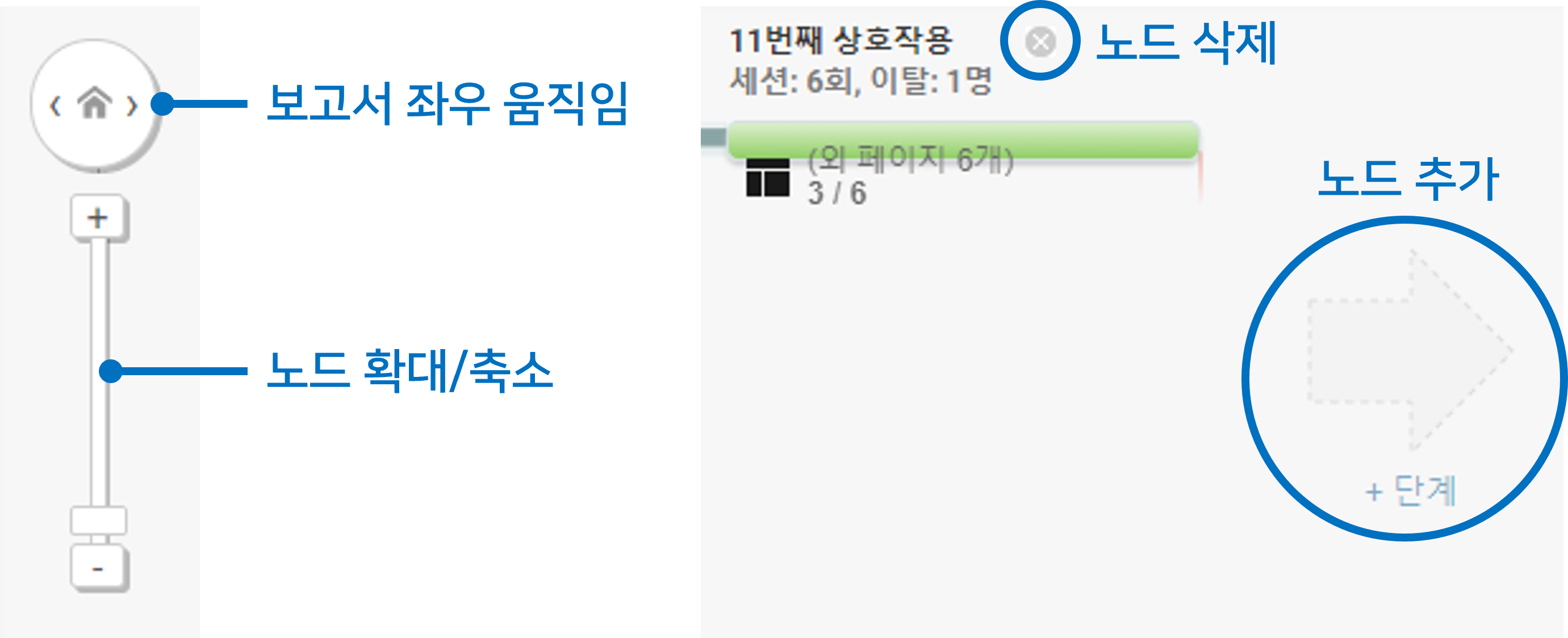 - 해당 상호작용에서 닫기 버튼을 누르면 노드 열이 삭제되고, 우측 끝에 있는 +단계 를 클릭하면 노드 열을 추가할 수 있습니다. (노드 열은12번째 상호작용까지만 추가할 수 있습니다.)