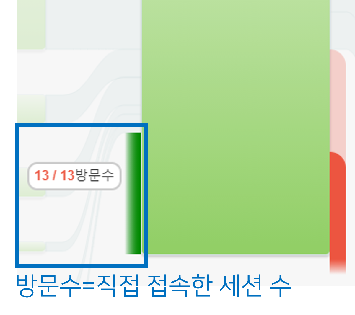 0단계 노드의 좌측에 하단에 있는 초록색 바에 마우스오버시 방문수가 보이는데, 방문수는 즐겨찾기나 링크 등을 통해 직접 접속한 세션수를 나타냅니다.