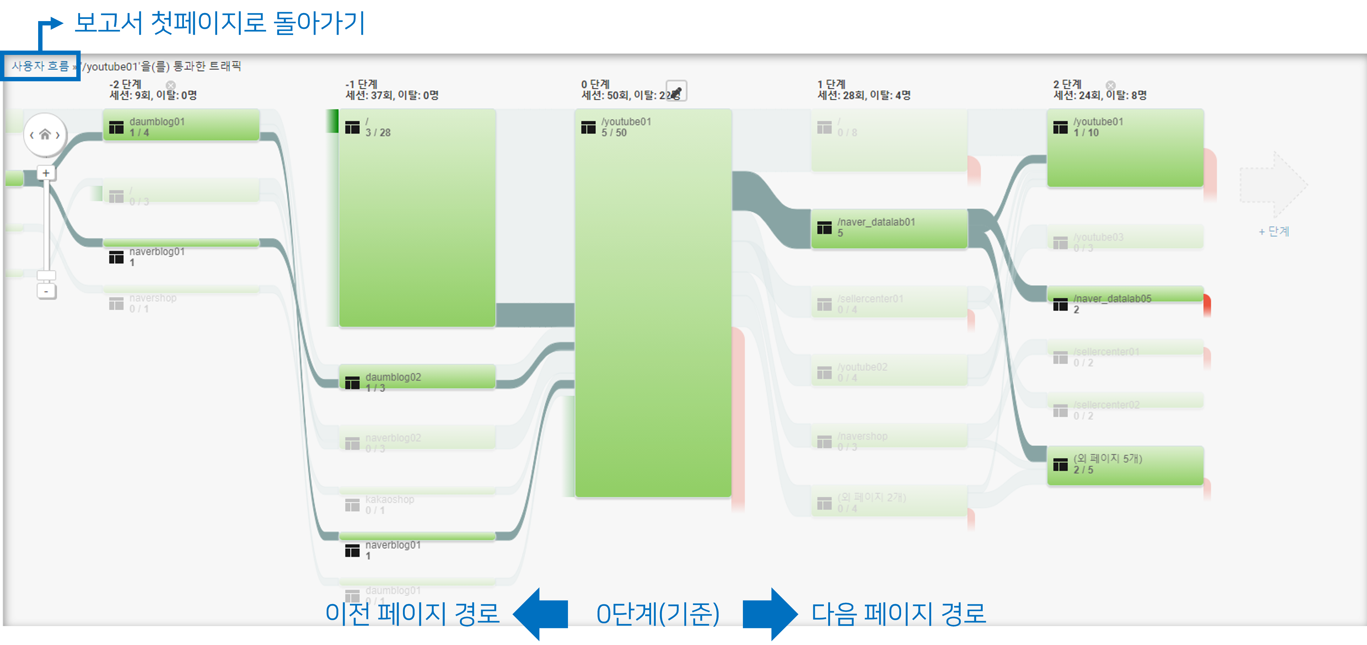 통과 트래픽 조사를 클릭하면 선택한 노드(페이지)가 0단계(기준)로 설정되어 선택한 노드를 기준으로 어떤 페이지를 통해 왔는지, 어떤 페이지로 넘어가는지에 대한 흐름을 볼 수 있습니다. 우측 상단 사용자 흐름을 클릭하시면 보고서의 첫 페이지로 돌아갈 수 있습니다.