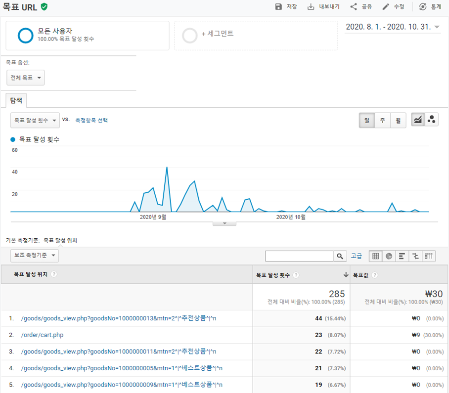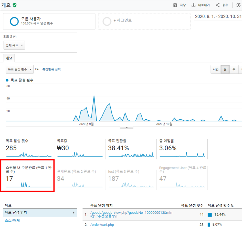 개요보고서의 기본 화면에서는 설정한 모든 목표에 대한 데이터로 구성되어 있는데,