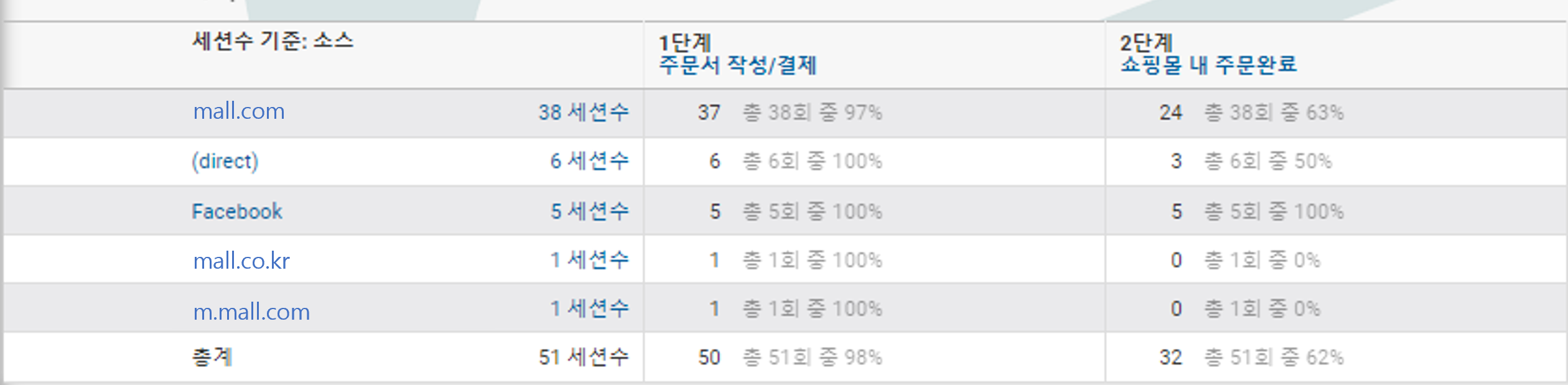 사진에서 보면 세션수 기준을 소스로 했을 때, 유입된 소스별로 단계마다 얼마나 유입이 되었는지와 총 유입수를 볼 수 있습니다.