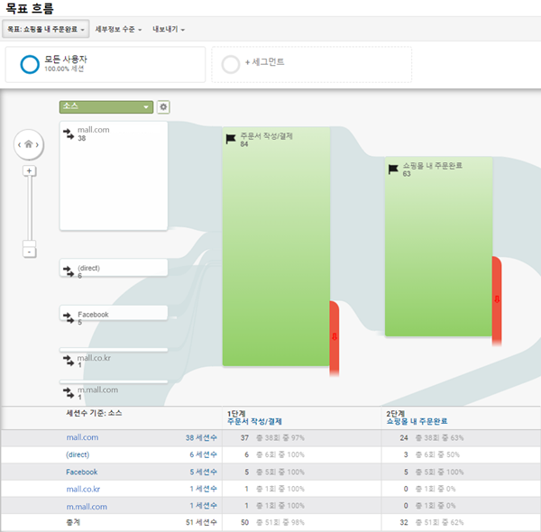 목표 흐름 보고서를 통해 사용자가 어떤 유입경로로 목표까지 도달하였는지, 그리고 이탈 경로까지 한눈에 파악할 수 있습니다.