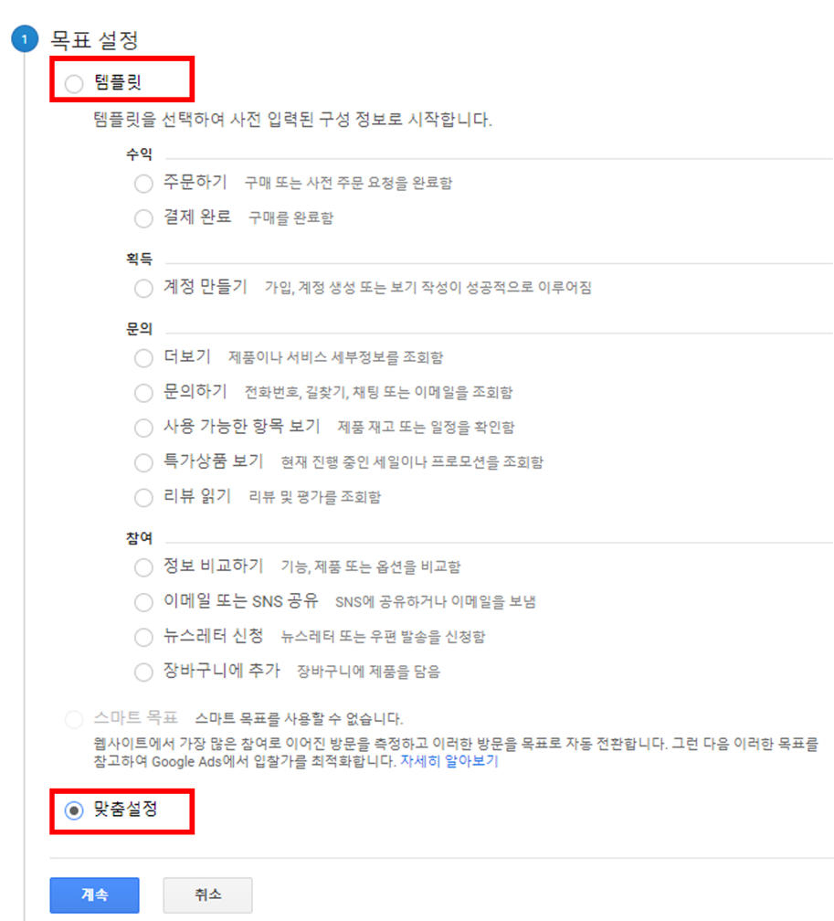 기본 템플릿 이외에 설정이 필요하면 맞춤설정을 선택하여 원하는 목표 설정을 할 수 있습니다.)