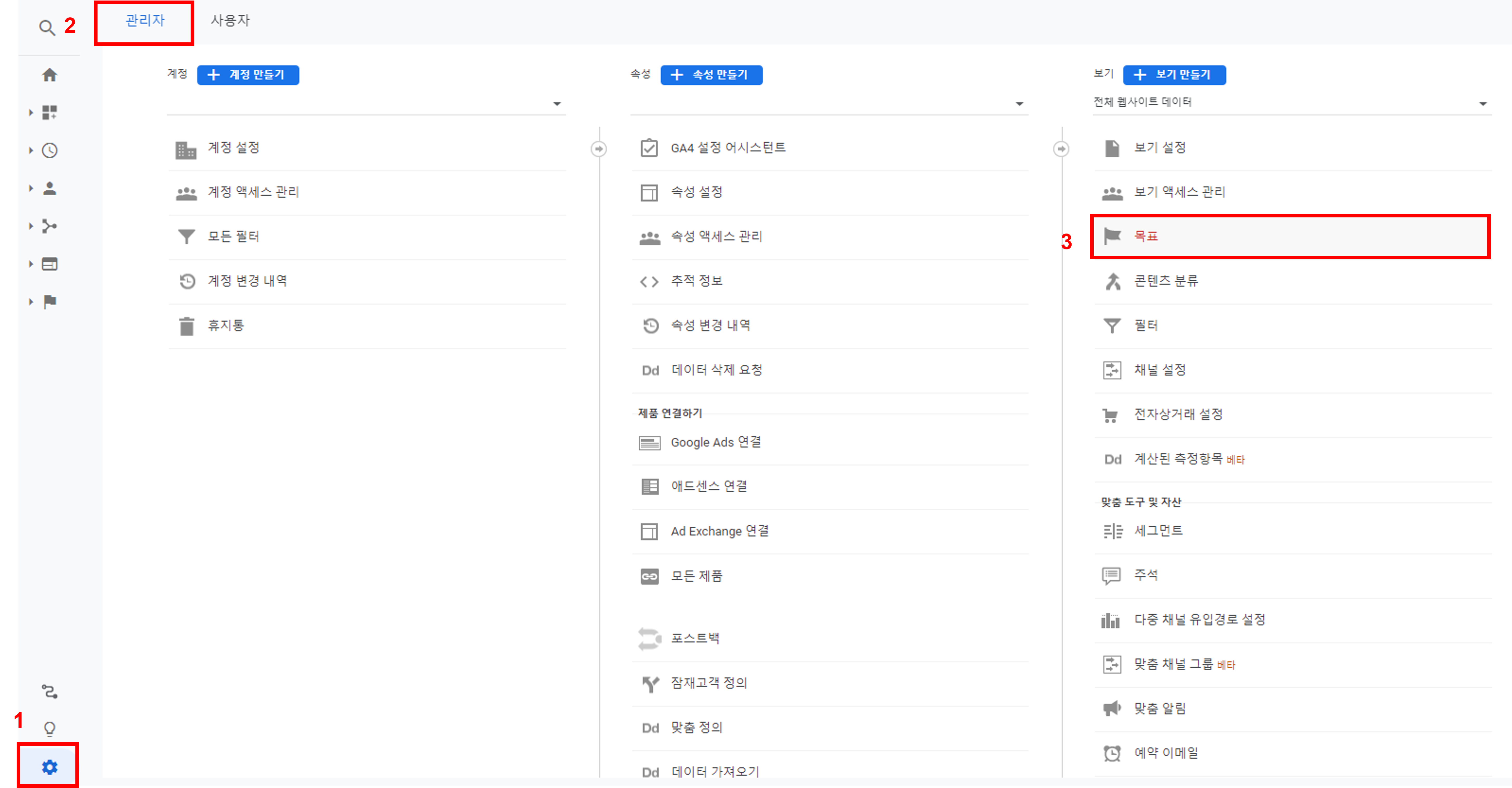 01. 구글애널리틱스에서 좌측 하단에 있는 관리 버튼을 누른 후 관리자탭의 보기 메뉴에서 목표를 클릭합니다.