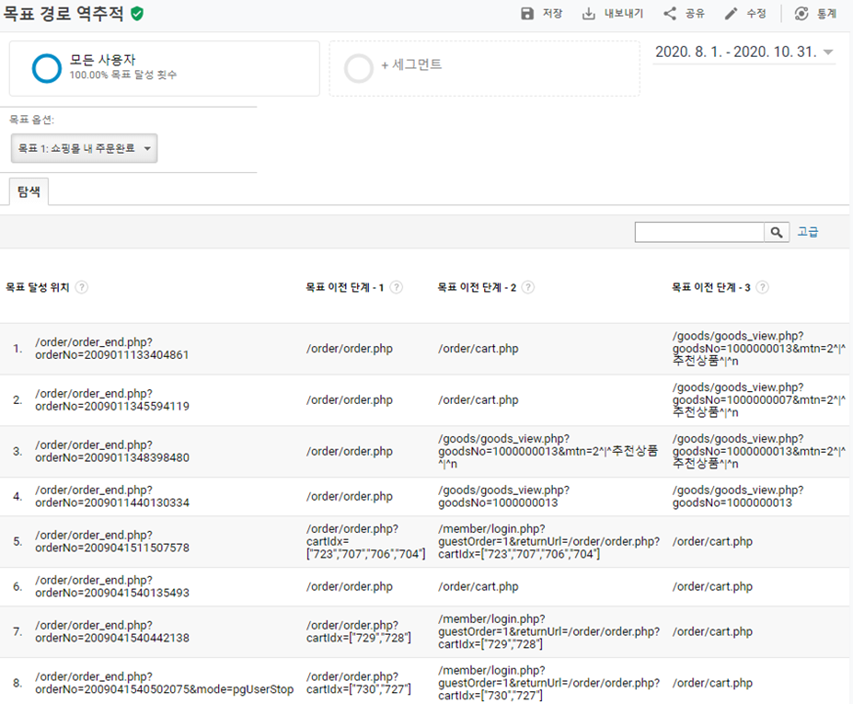 목표 경로 역추적 보고서는 말 그대로 목표가 달성된 페이지를 역추적하여 이전에 어떤 페이지를 거쳐서 목표 페이지로 도달하였는지를 보여주는 보고서입니다.