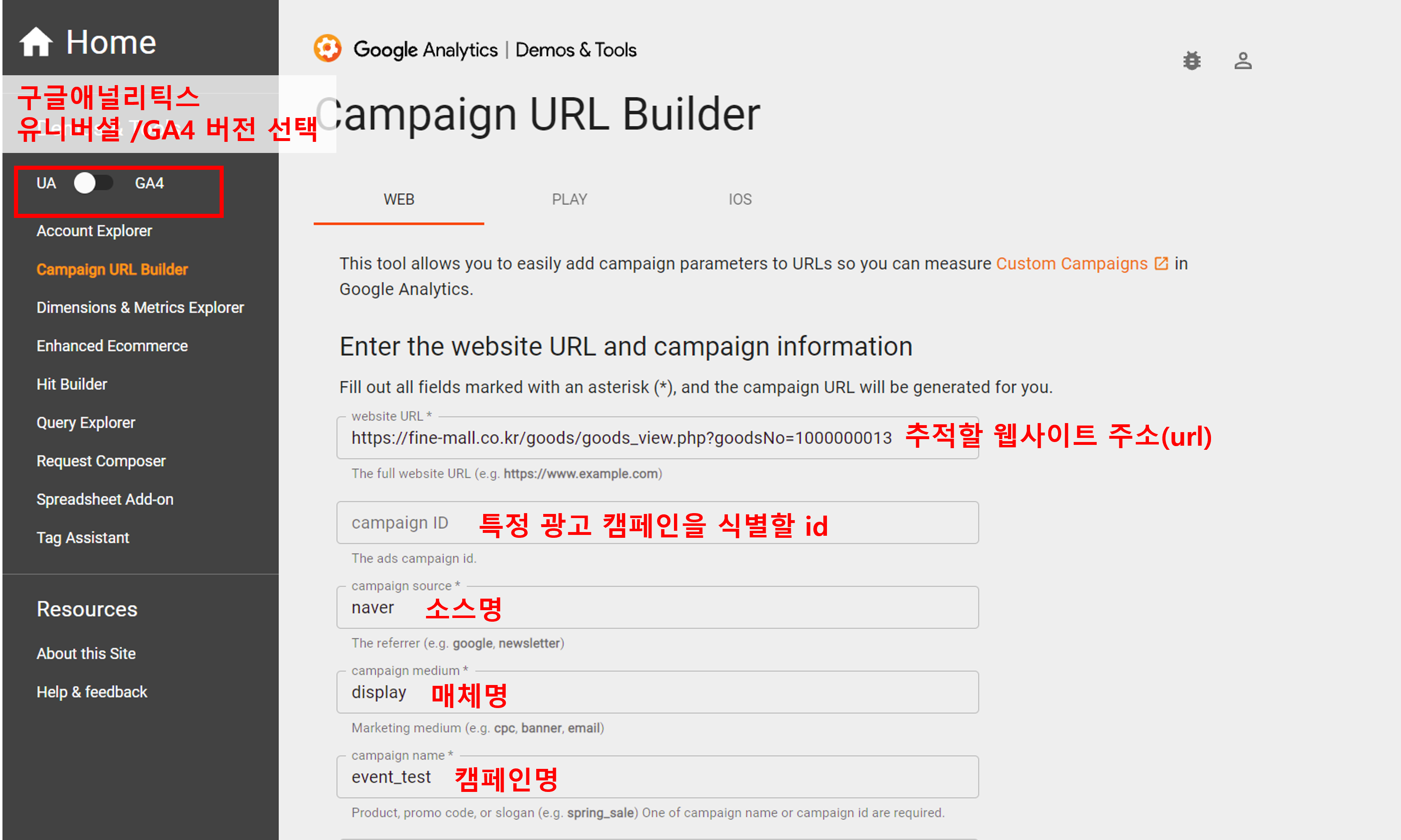 맞춤캠페인 설정 시 구글애널리틱스에서 제공하는 campaign url builder를 사용하면 UTM 태깅을 쉽게 할 수 있습니다.