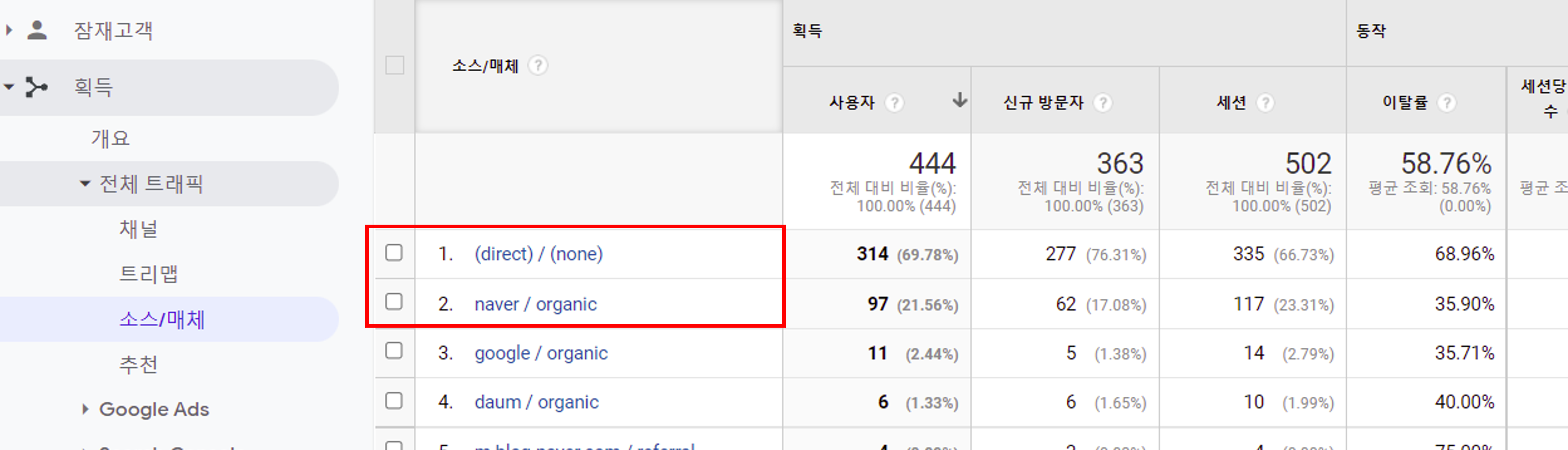 리퍼러 정보가 없는 유입일 경우(ex. 링크로 접속 등) 모두 직접 유입으로 분류되기 때문에 다른 유입이 포함되면서 소스/매체에 대한 분석의 정확도가 떨어지게 됩니다.