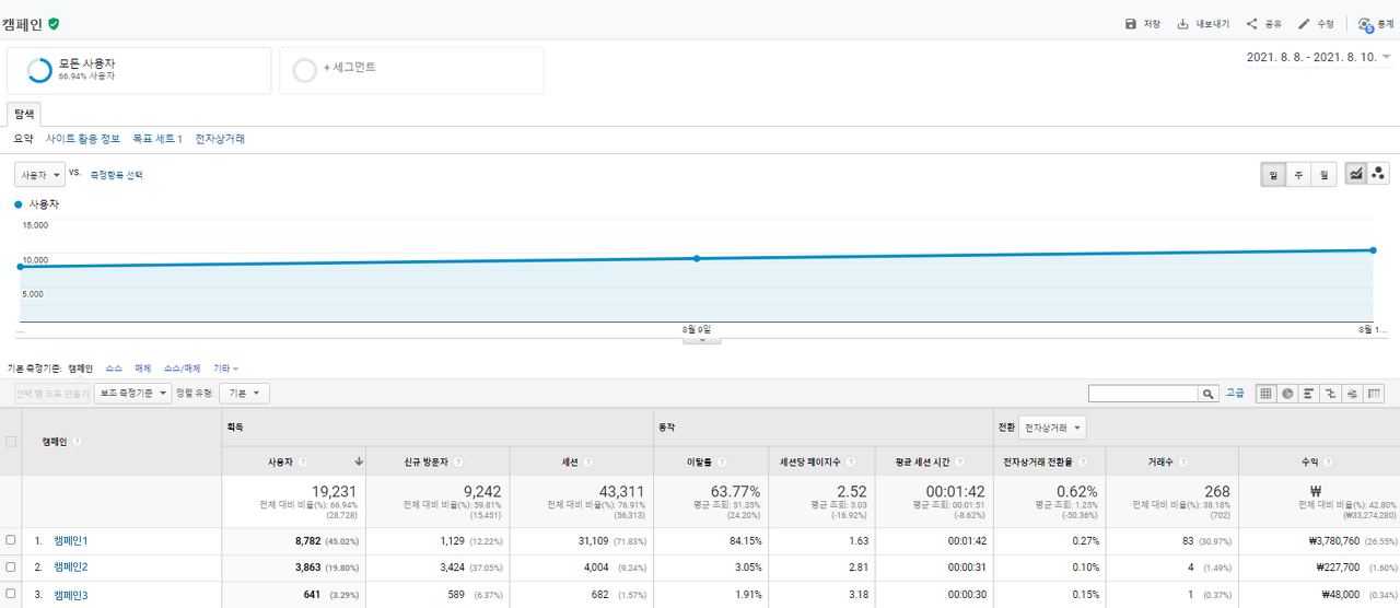 광고 마케팅을 하고 있을 경우 광고에 대한 맞춤 캠페인을 설정하여 구글애널리틱스 캠페인 보고서를 활용하면 좋습니다.