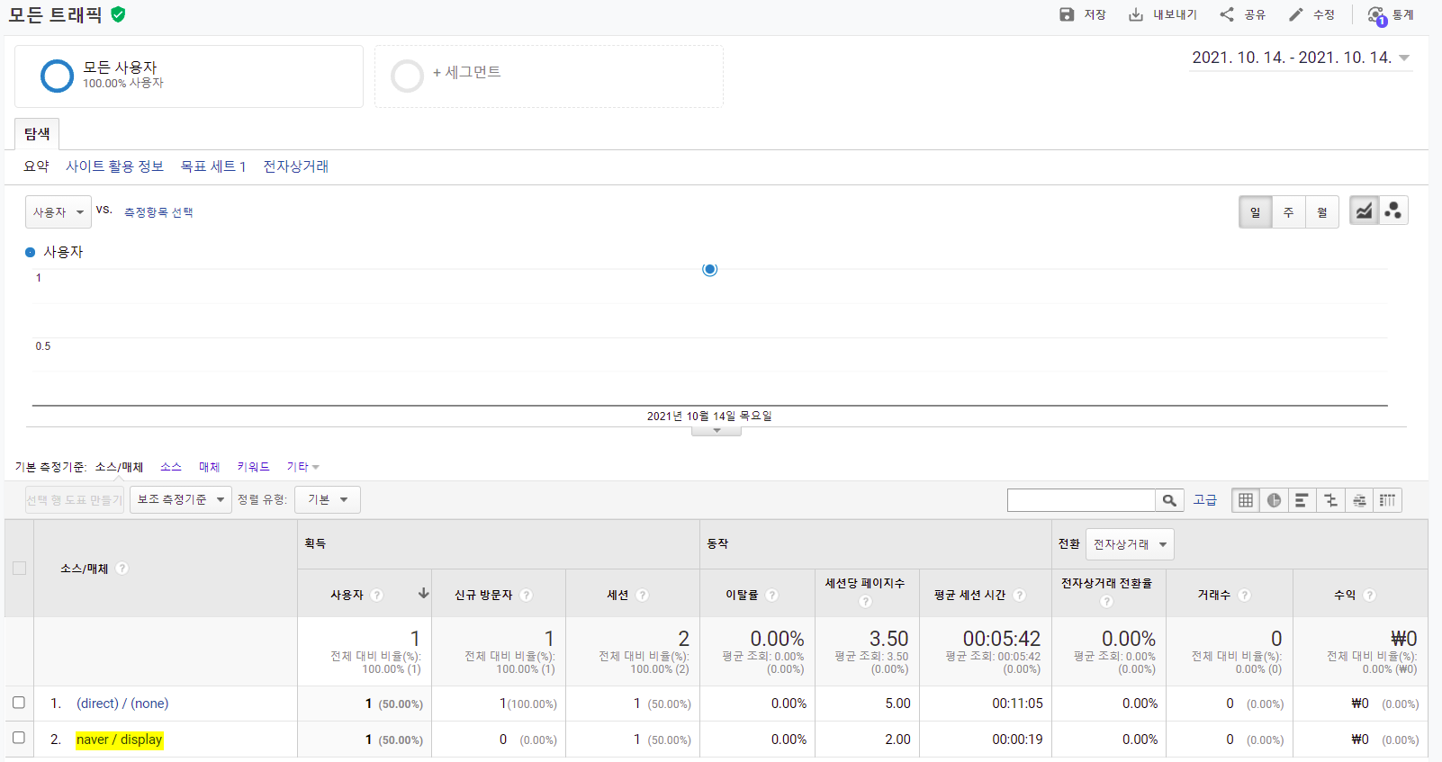 이 url의 유입의 소스/매체는 입력된 utm코드에 따라 naver/display로 나타나는 것을 볼 수 있습니다.