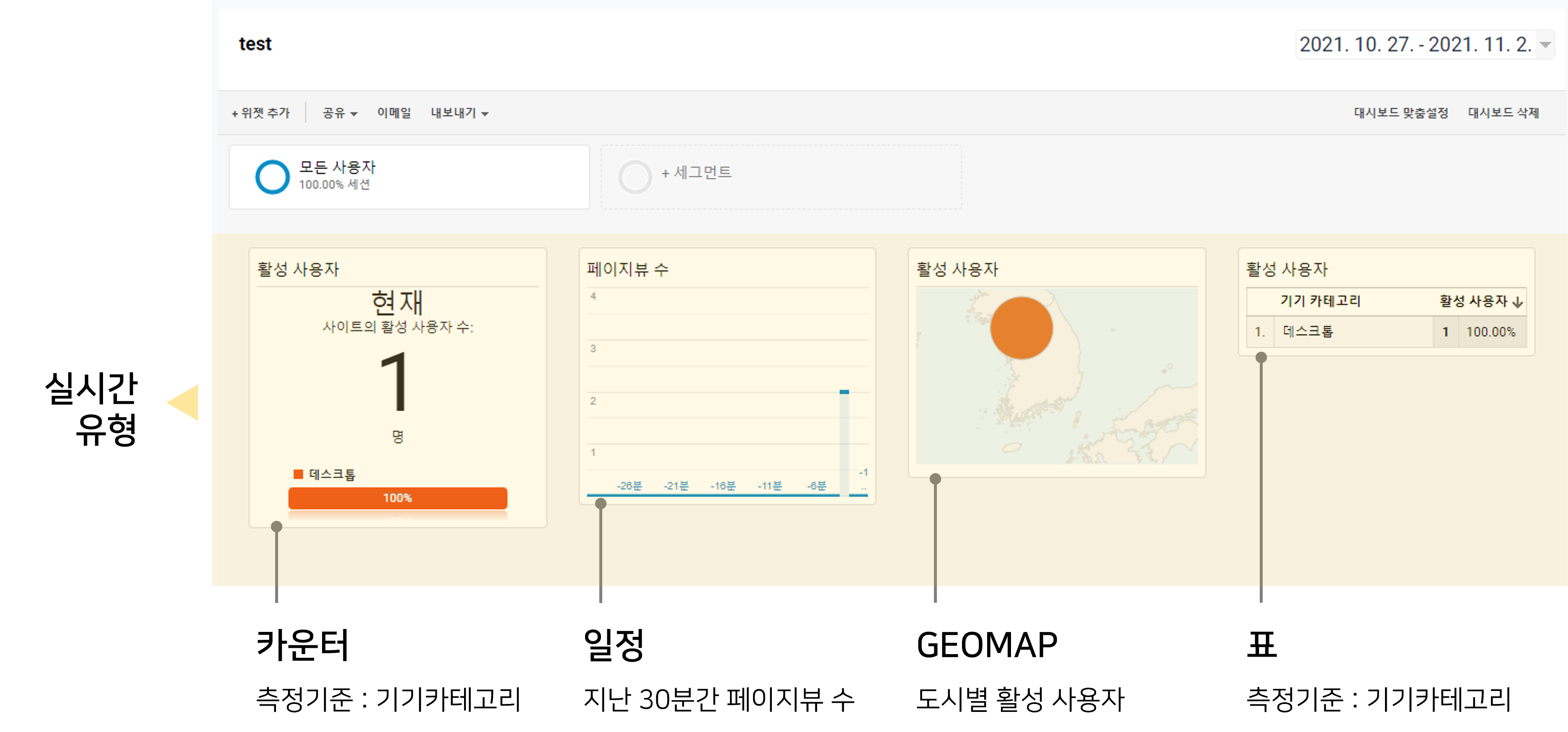 카운터와 표는 측정기준을 기기카테고리로 하여 데스크톱에서 활성 사용자가 1명 있음을 각각 카운터와 표로 보여주고 있습니다.