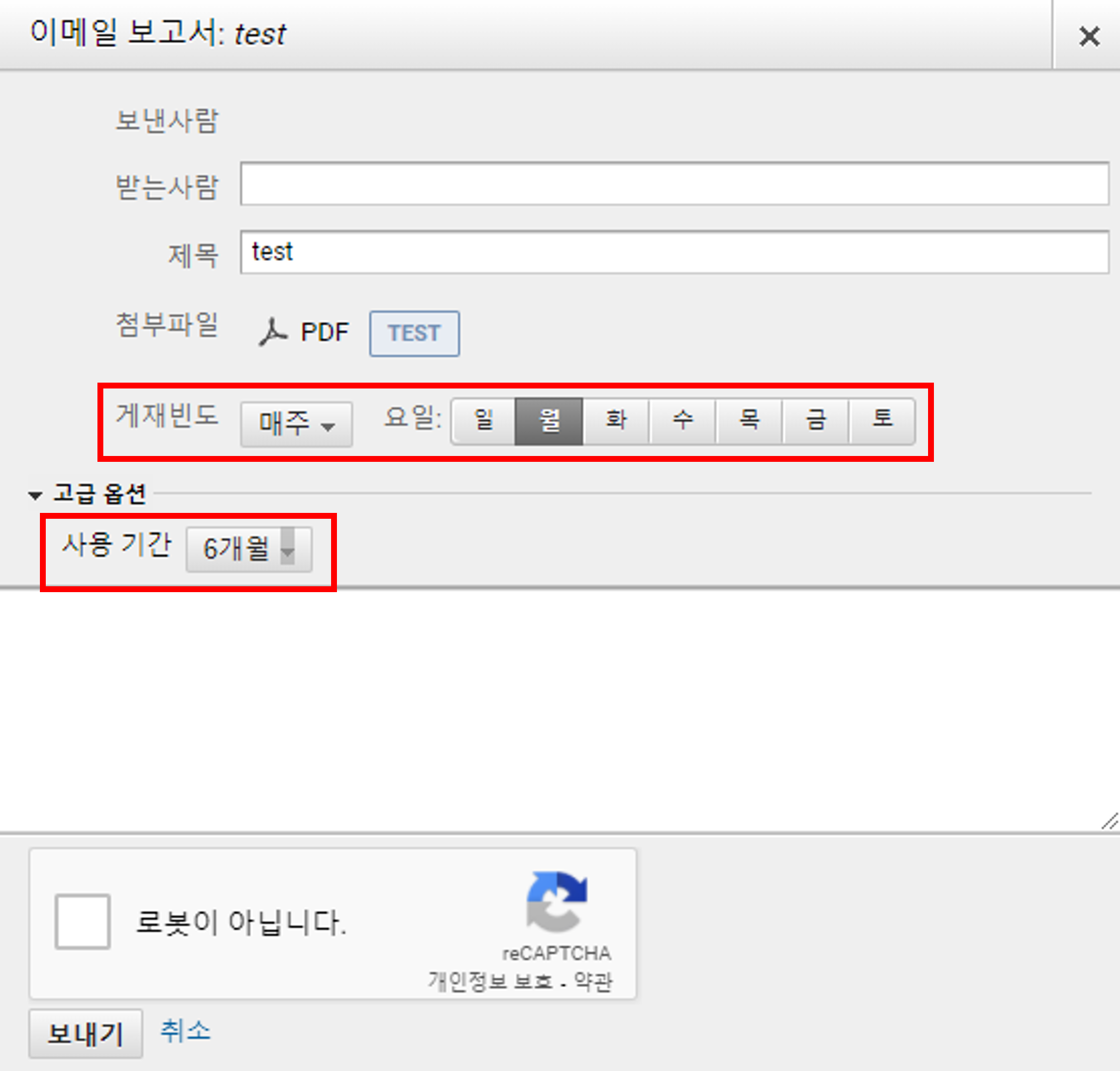 고급 옵션에서 사용기간을 설정하면 정기 전송 기간을 조정할 수 있고, 기간 만료 시에는 이메일 전송 예약을 다시 설정해야 합니다.
