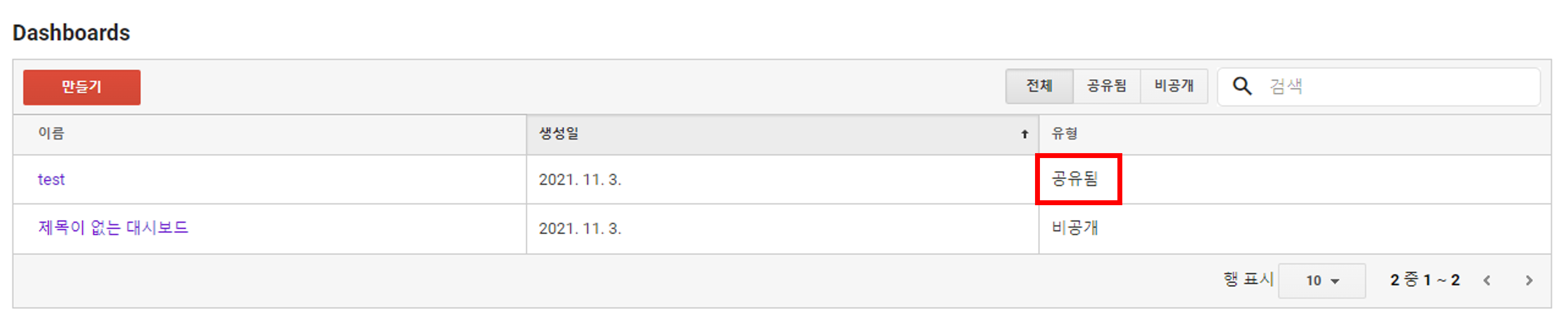 - 솔루션 갤러리에서 공유 : 대시보드의 갤러리에서 구글애널리틱스 사용자와 공유