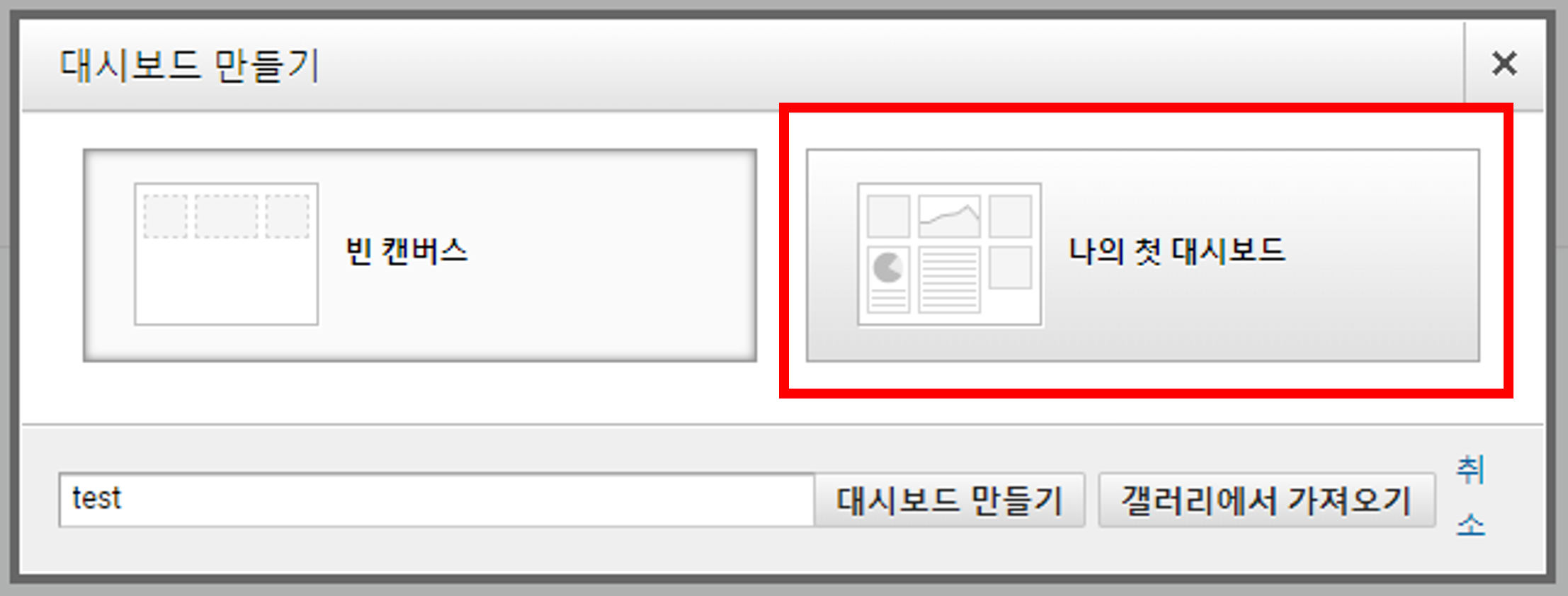 - 갤러리에서 가져오기 : 다른 사용자들이 공유한 대시보드를 가져와서 사용할 수 있습니다.