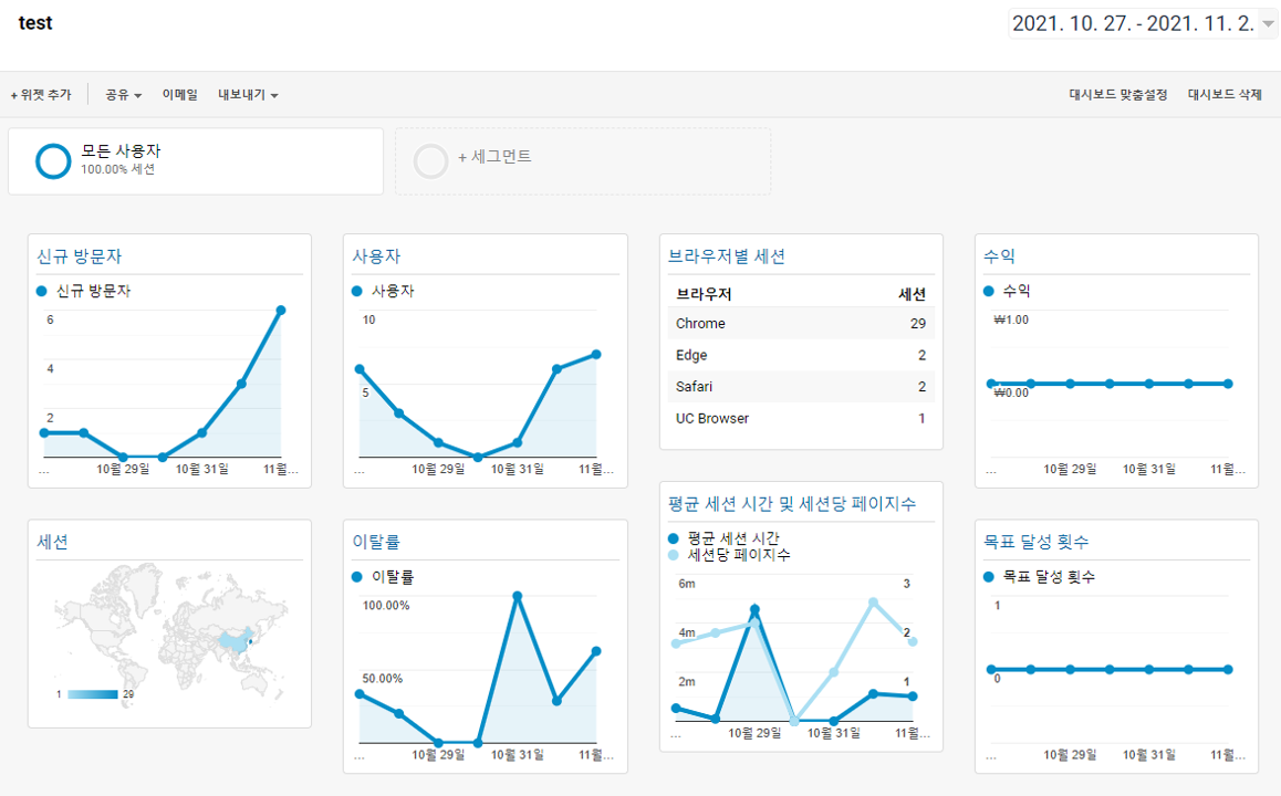 구글애널리틱스 대시보드는 여러 보고서를 빠르게 모니터링 할 수 있도록 개요 위젯을 모아 놓은 페이지입니다.