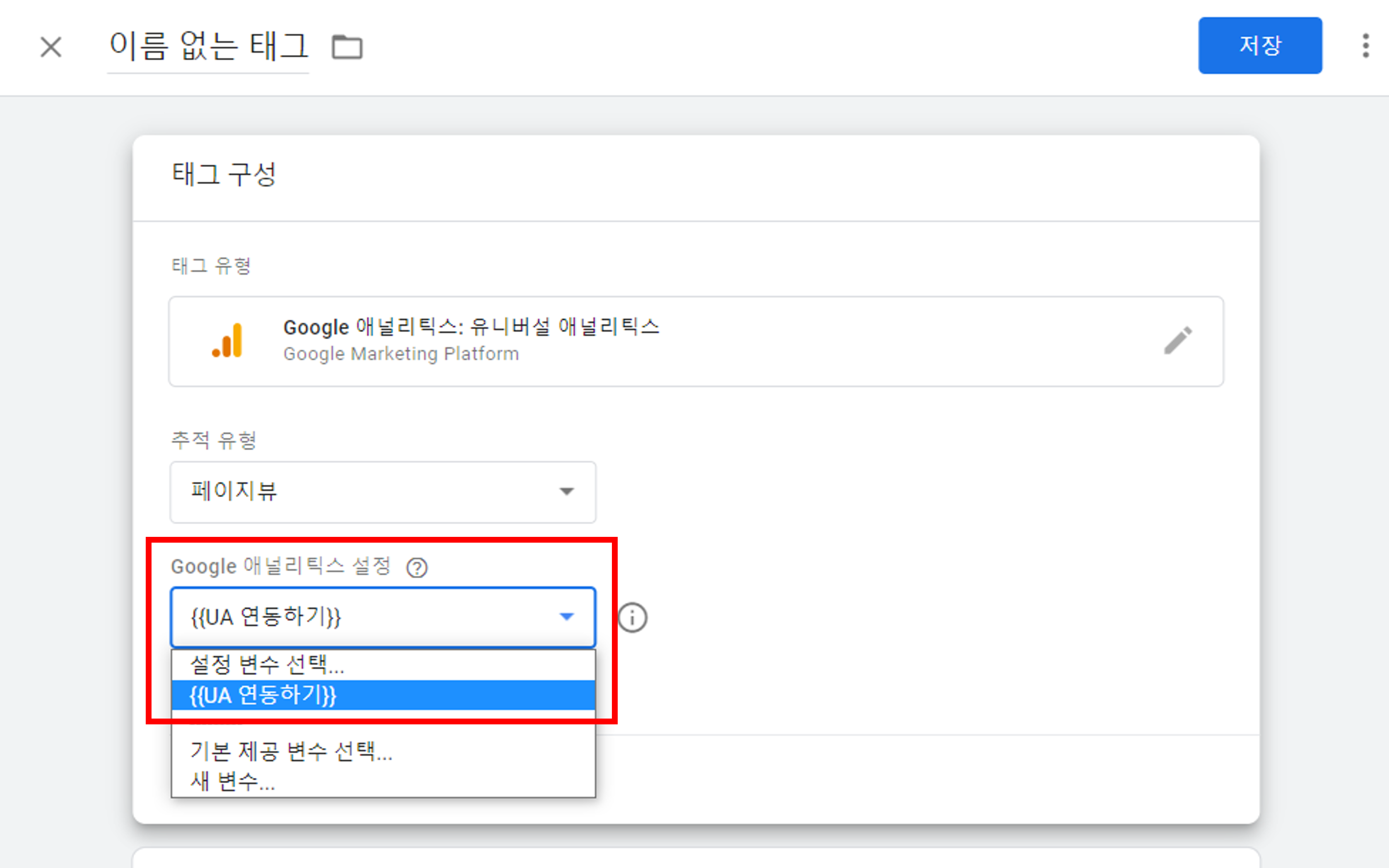 3. 변수 이름을 입력하고, 추적 ID 에 연동하고자하는 구글애널리틱스의 추적 ID를 입력해줍니다.