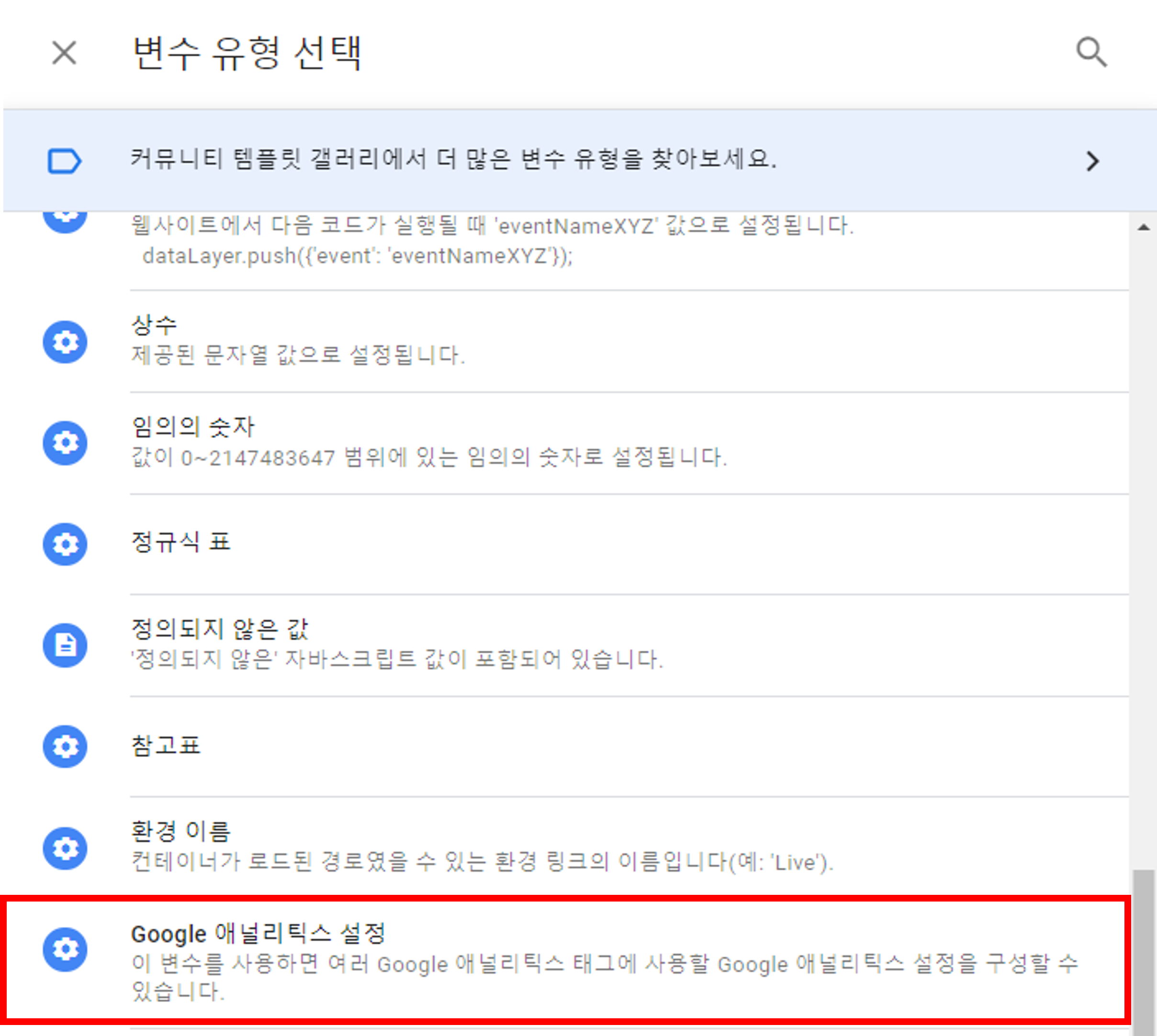 2. 변수 구성을 클릭하여 변수 유형 선택창에서 Google 애널리틱스 설정을 선택해줍니다.