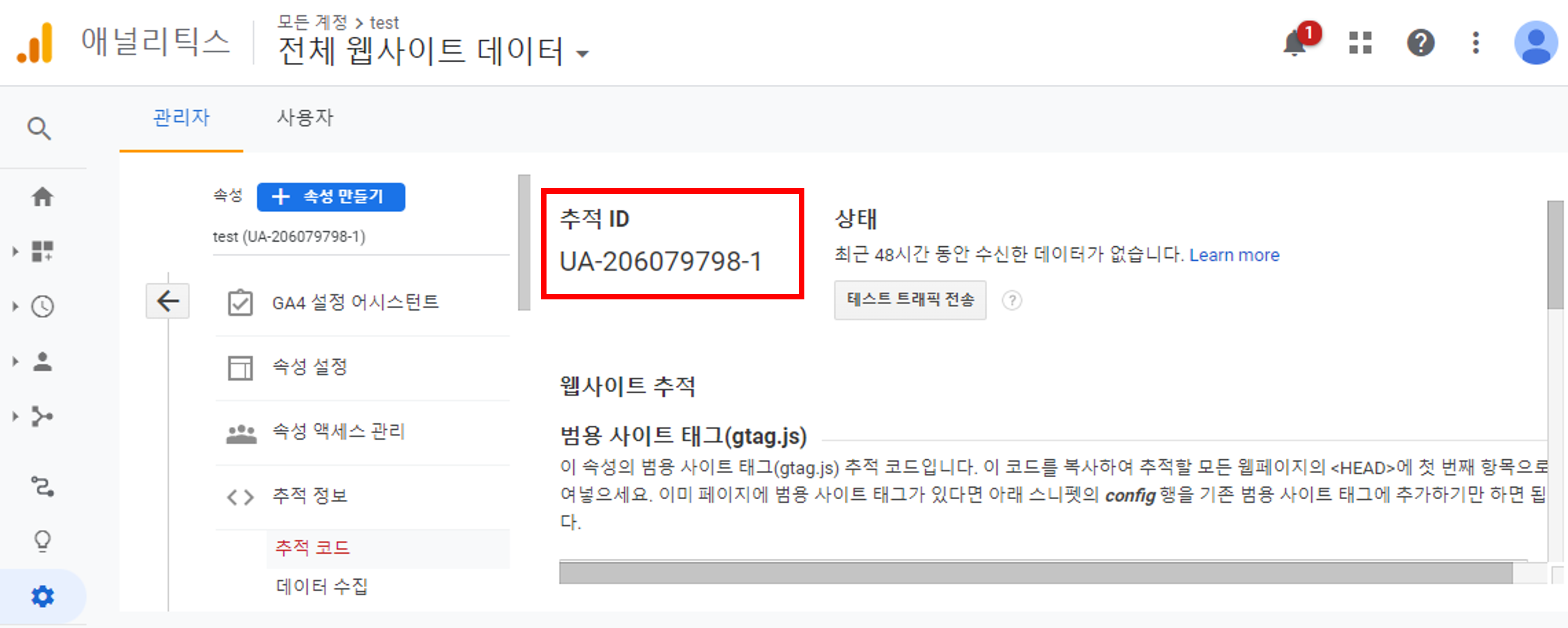 * 구글애널리틱스(GA) 추적 ID는 구글애널리틱스 > 관리 > 속성 > 추적 정보 > 추적 코드에서 알 수 있습니다.