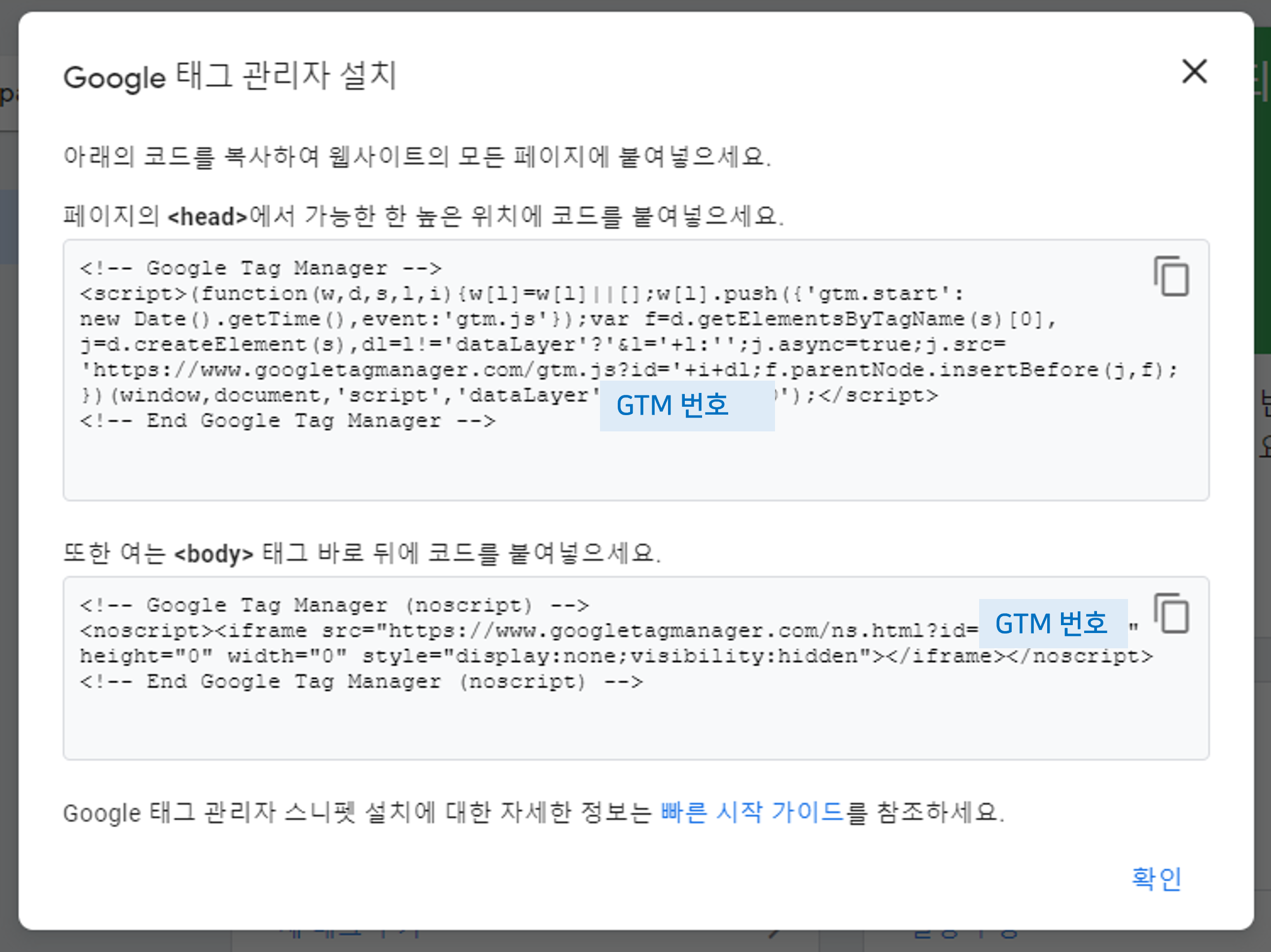 5. Google 태그 관리자 설치 코드가 생성됩니다.