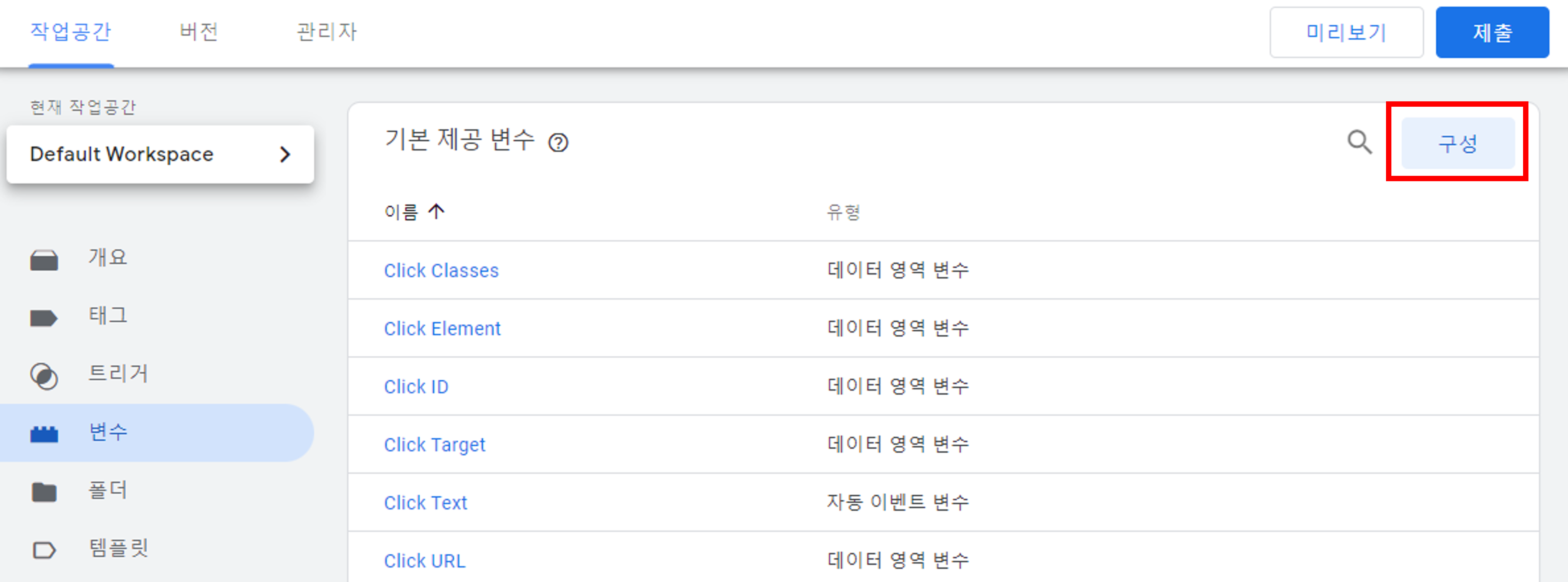 1. 구글태그매니저(GTM)에서 초기에 변숫값을 설정해놓지 않았다면 변수에 들어가서 기본 제공 변수를 먼저 구성해주어야 합니다.