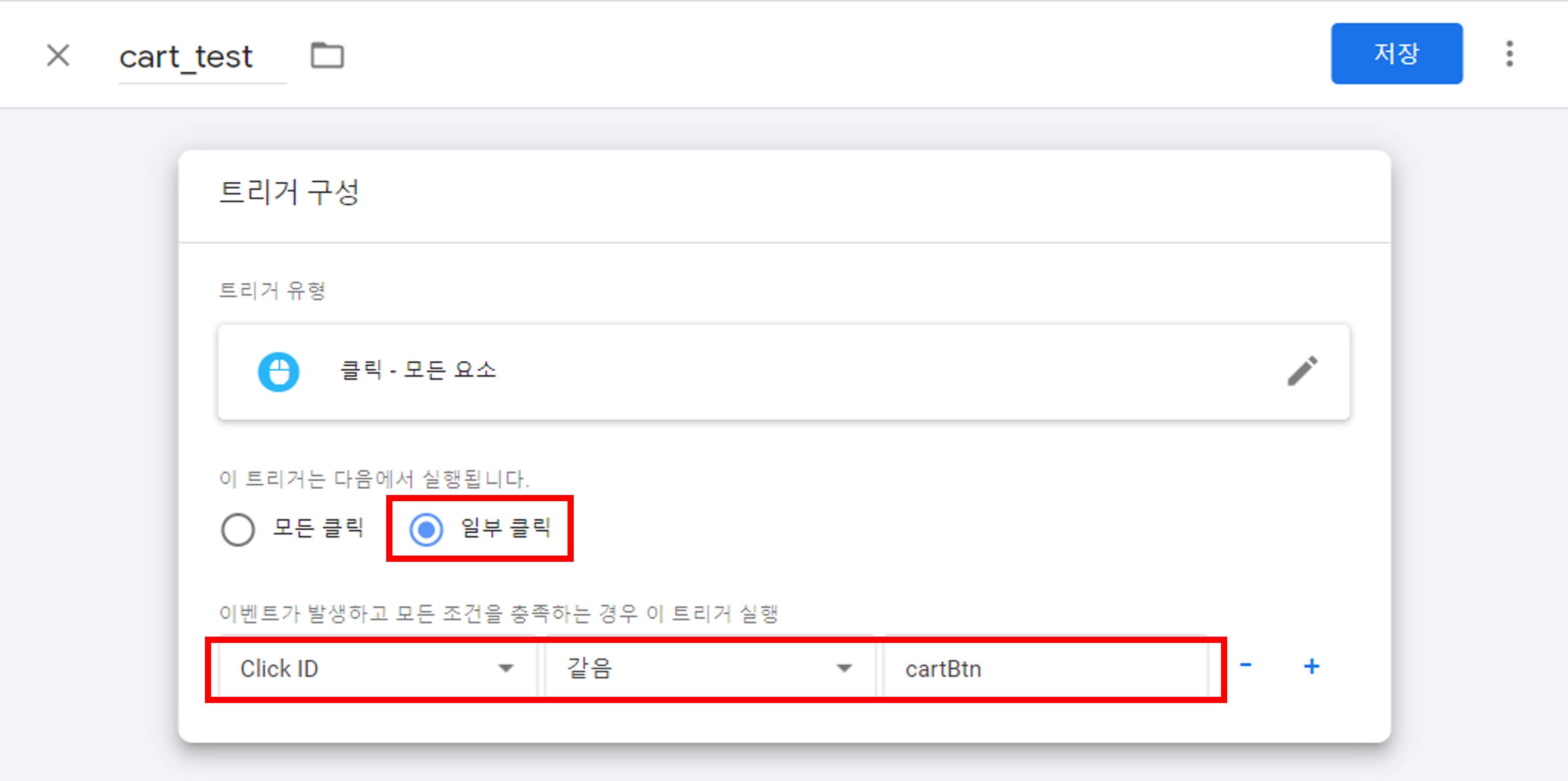 Click ID를 변수로 사용한다면 cartBtn 이라는 값과 같을 때로,