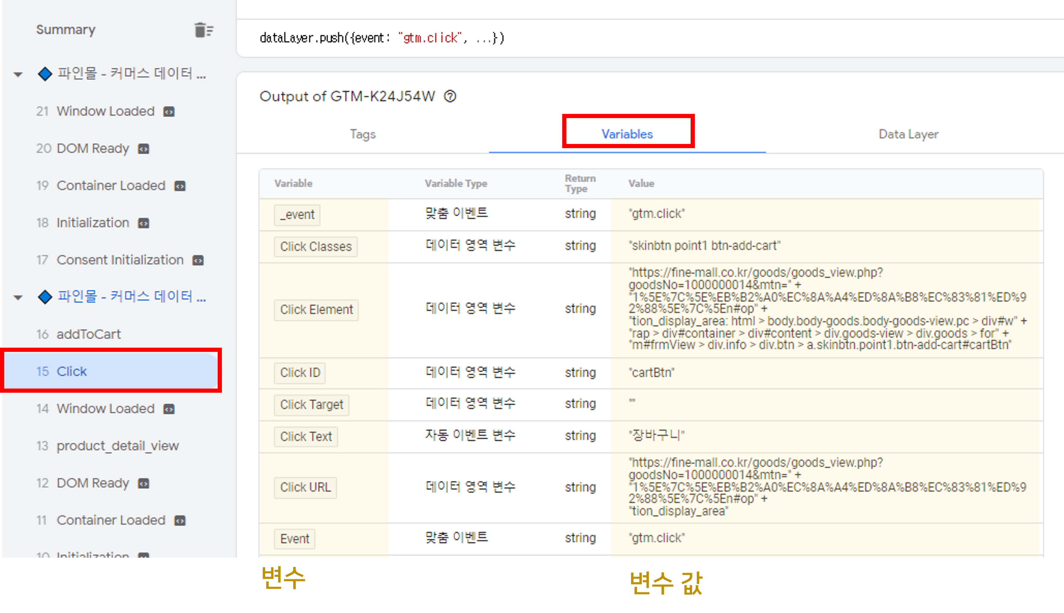 그러면 어떤 변숫값이 들어왔는지 변수와 변숫값에 대한 정보를 확인할 수 있습니다. 여기서 click 변수에 주목해주세요.