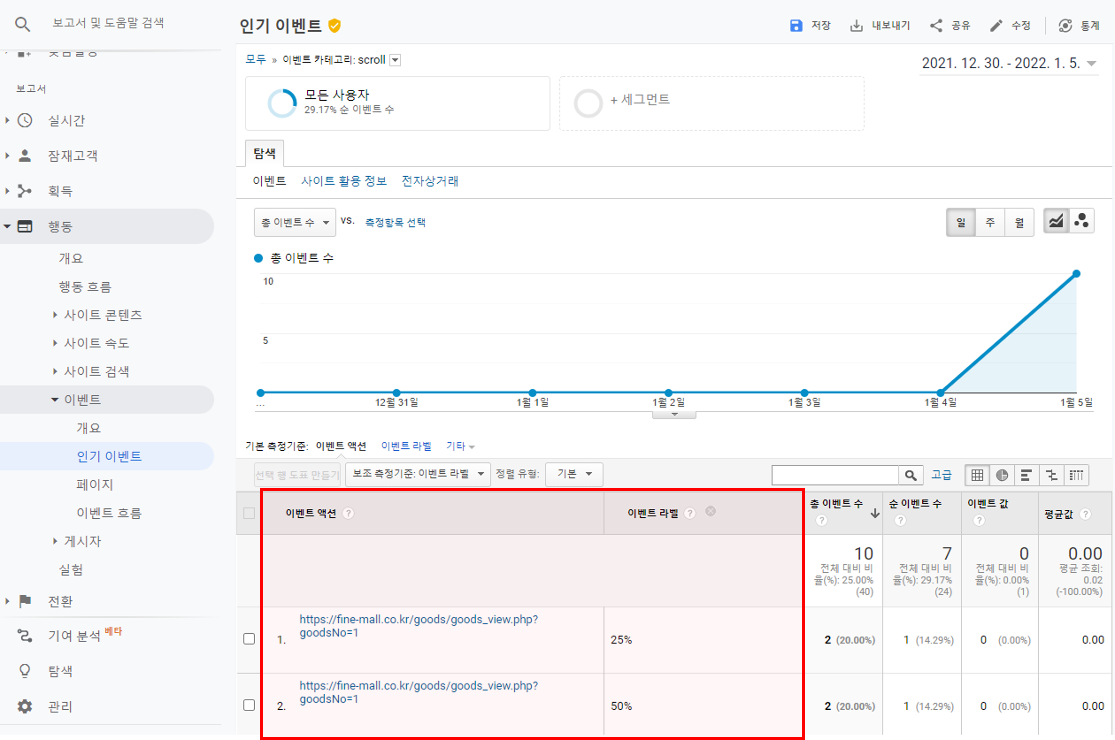 5. 구글애널리틱스(GA)의 행동-이벤트 보고서에서도 값이 잘 들어오는지 확인해줍니다.