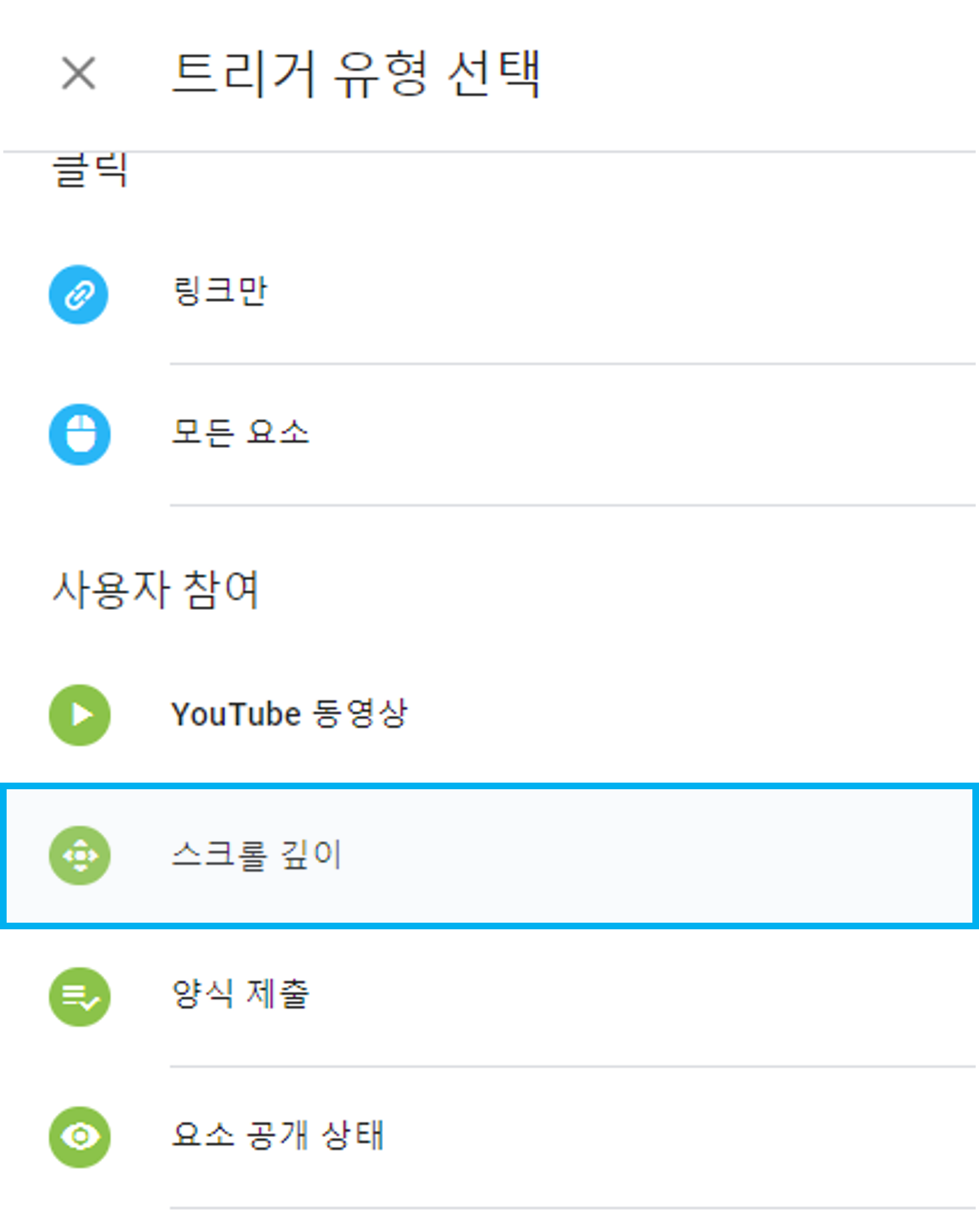 먼저 트리거 유형을 스크롤 깊이로 지정해줍니다.