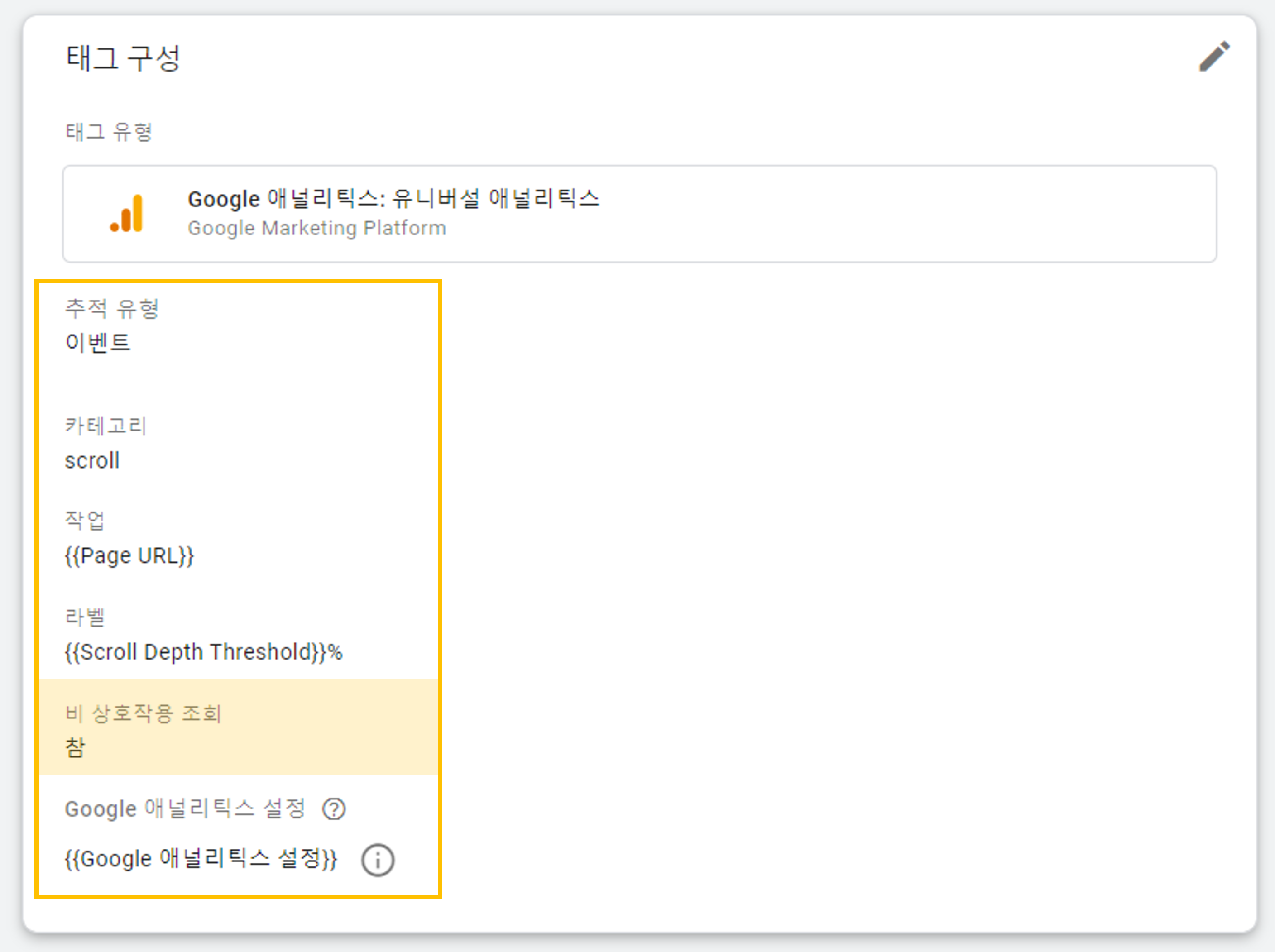 비 상호작용 조회는 참으로 설정해주고, Google 애널리틱스 설정에서 구글애널리틱스(GA)와 연동된 변수를 선택해주고 저장해줍니다.