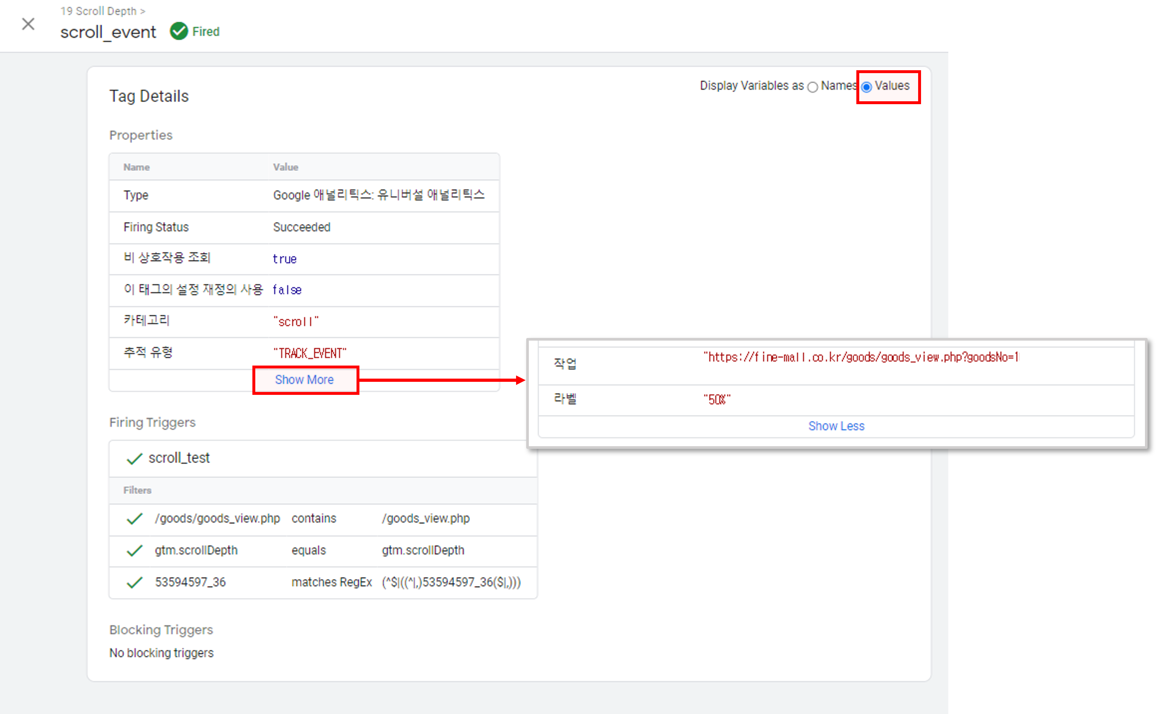 우측 상단에 보기값을 Values 로 설정해주고, Properties 에서 Show More 버튼을 클릭해주면 작동된 이벤트의 작업,라벨 값을 확인할 수 있습니다.