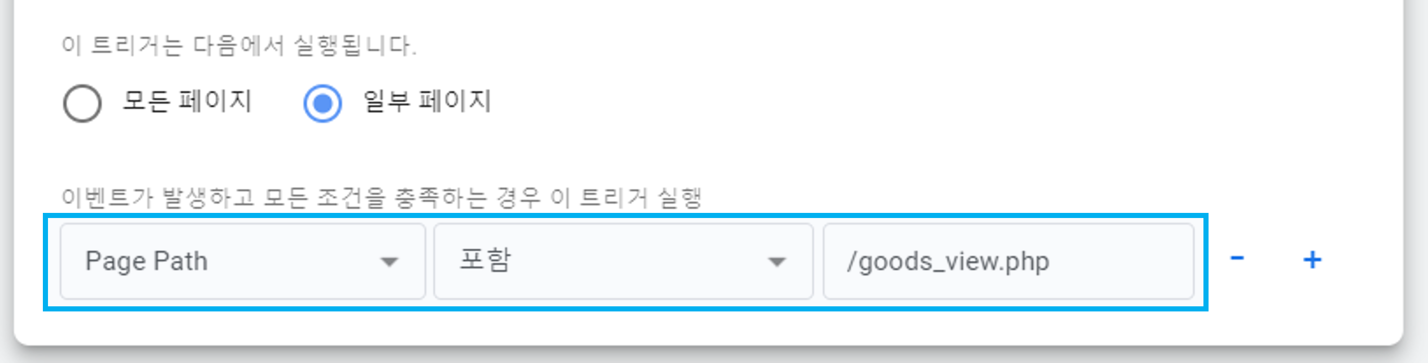 그리고 상품 상세페이지에서의 스크롤 이벤트만 수집하고자 일부페이지를 체크해주고 Page Path로 조건을 만들어주었습니다. 만약 모든 페이지의 스크롤 이벤트를 수집하고자 한다면 모든 페이지를 선택해주면 됩니다.