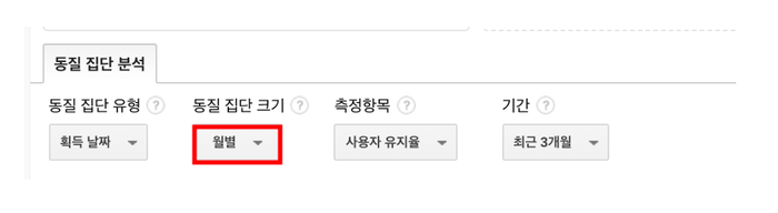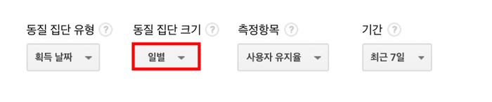 | - 동질 집단 유형 : 획득 날짜는 사용자가 콘텐츠와 상호작용 한 것이 처음 인식된 시점을 말합니다. 동질 집단 분석 보고서에서 이 기능을 선택하면 사용자가 첫 번째 세션을 시작한 시점을 바탕으로 동질 집단이 그룹화 됩니다. - 동질 집단 크기 : 일별, 주별, 월별로 선택 가능합니다. - 측정 항목 : 보고자 하는 데이터에 따라 다르게 설정이 가능합니다. ex) 사용자 유지율, 페이지 뷰 수, 사용자 수 등 - 기간 : 기간은 일별, 주별, 월별로 다르게 정할 수 있습니다. 일별은 최대 30일, 주별은 최대 12주, 월별은 최대 3개월까지 확인이 가능합니다. |