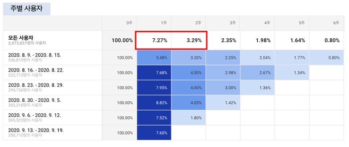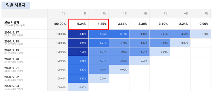 그리고 2일 뒤에는 5.95% 사용자가 유지됩니다. 마찬가지로 7일 후까지 이용자 비율을 파악할 수 있습니다.