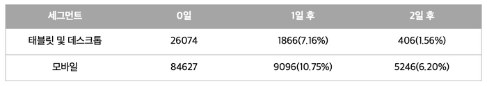 1일 뒤 : 태블릿 및 데스크 톱 = 1,866(7.16%) / 모바일 = 9,096(10.75%) 감소
