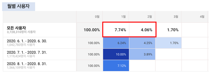 마지막으로 월별 사용자의 표를 보면 1개월에서 2개월로 넘어가는 시점에 3.68% 가장 유지 비율이 떨어지는 것을 알 수 있습니다.