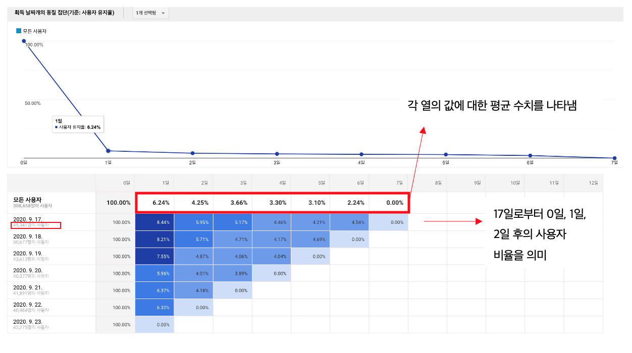또한 동질 집단 보고서의 표에서 각 행은 사용자의 최초 이용일을 의미합니다.