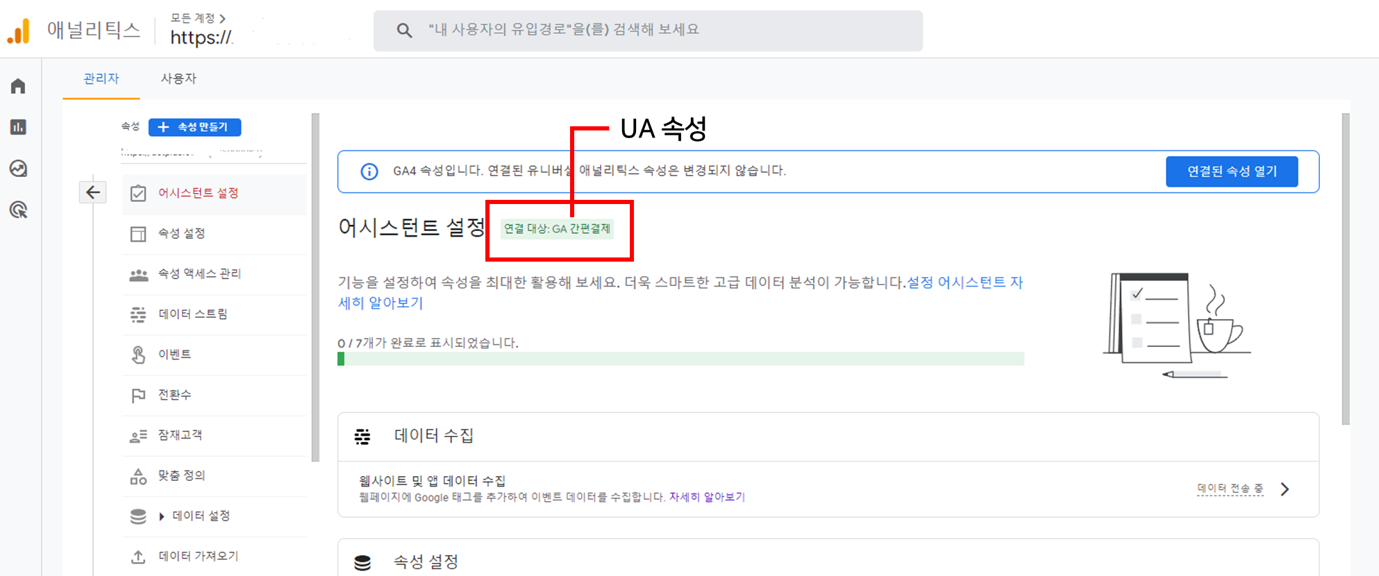 우선 GA4 속성이 UA와 연결되어 있는지 확인합니다.