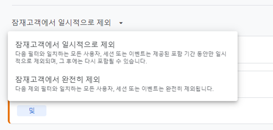 - 잠재고객에서 일시적으로 제외 : 포함 기간 동안만 일시적으로 제외, 이후에는 다시 포함될 수 있음