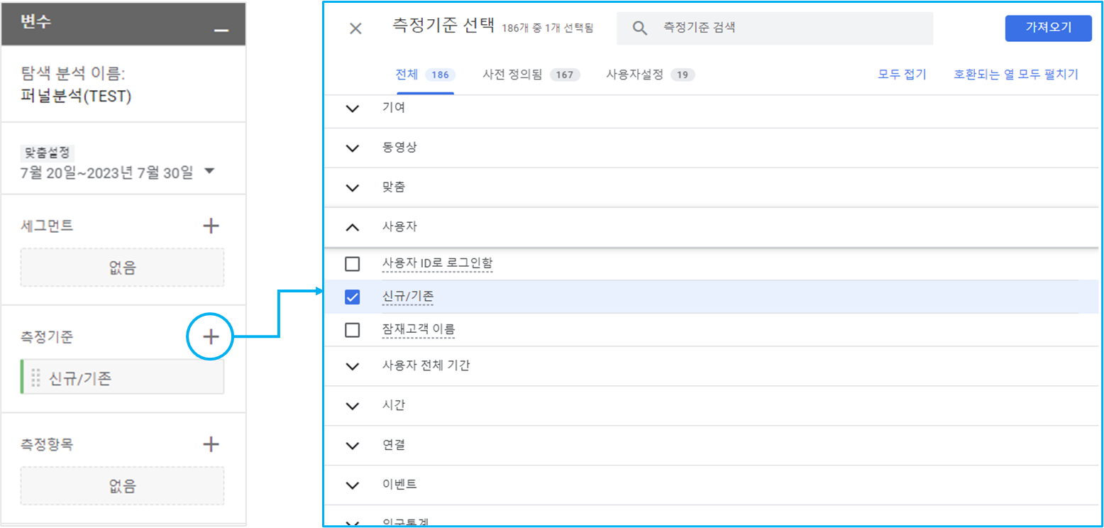 '기법' 에서 탐색 템플릿을 변경할 수 있으며, [변수]에서 설정한 세그먼트/측정기준/측정항목을 끌어오면 더욱 쉽게 설정할 수 있습니다.