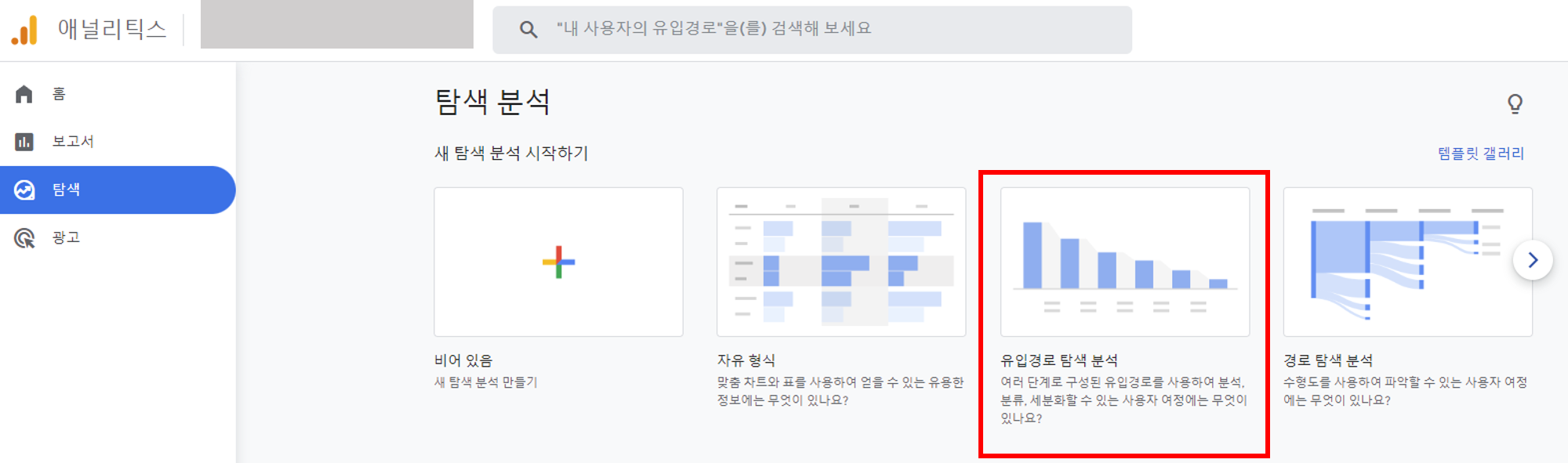1. 구글애널리틱스4(GA4) > 탐색 > 유입경로 탐색 분석을 선택하여 보고서 설정 페이지로 이동합니다.