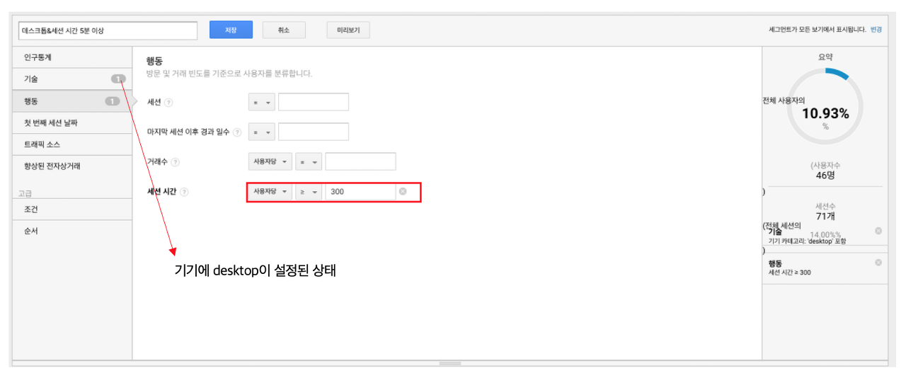 이전에 있던 데스크톱 트래픽에 세션 시간의 조건을 추가해주도록 하겠습니다.