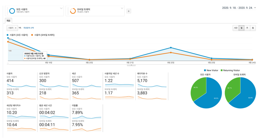 보고서를 보면 전체 사용자가 414명인데 모바일 트래픽의 사용자가 313명인 것을 볼 수 있습니다.