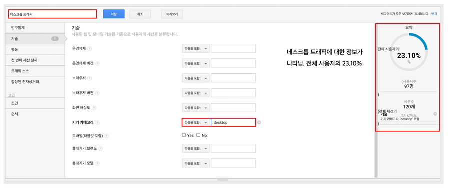 이전에 제가 만들었던 데스크톱 트래픽 세그먼트가 존재하는 것이 보입니다.